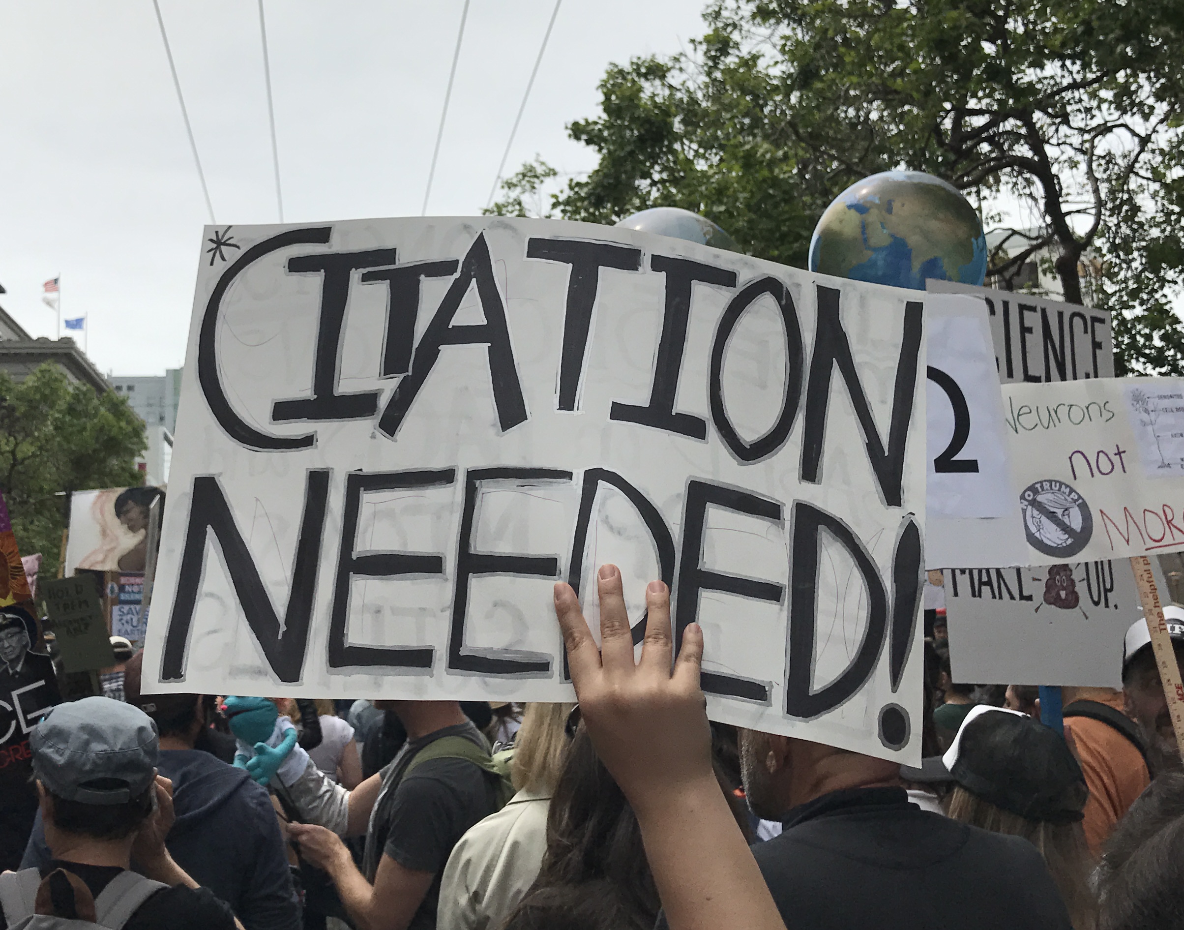 2010년, 미국의 텔레비전 진행자 존 스튜어트와 스티븐 콜베어워싱턴 D.C.내셔널 몰에서 Rally to Restore Sanity and/or Fear를 이끌었고, 일부 참가자들은 "citation needed" 표지판을 들었다.[6]