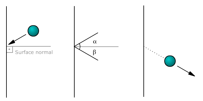 - '''탄성 충돌''': 총 운동 에너지의 전부가 보존되는 경우(즉, 소리, 열 등으로 에너지가 방출되지 않음) 충돌을 ''완전 탄성''이라고 한다. 이러한 시스템은 이상화이며 열역학 제2법칙으로 인해 실제로 발생할 수 없다.[4] 이상 기체의 충돌은 완벽하게 탄성 충돌에 접근하며, 전자기력에 의해 편향되는 아원자 입자의 산란 상호 작용도 마찬가지이다. 위성와 행성 간의 슬링샷 유형의 중력 상호 작용과 같은 일부 대규모 상호 작용은 거의 완벽하게 탄성적이다.