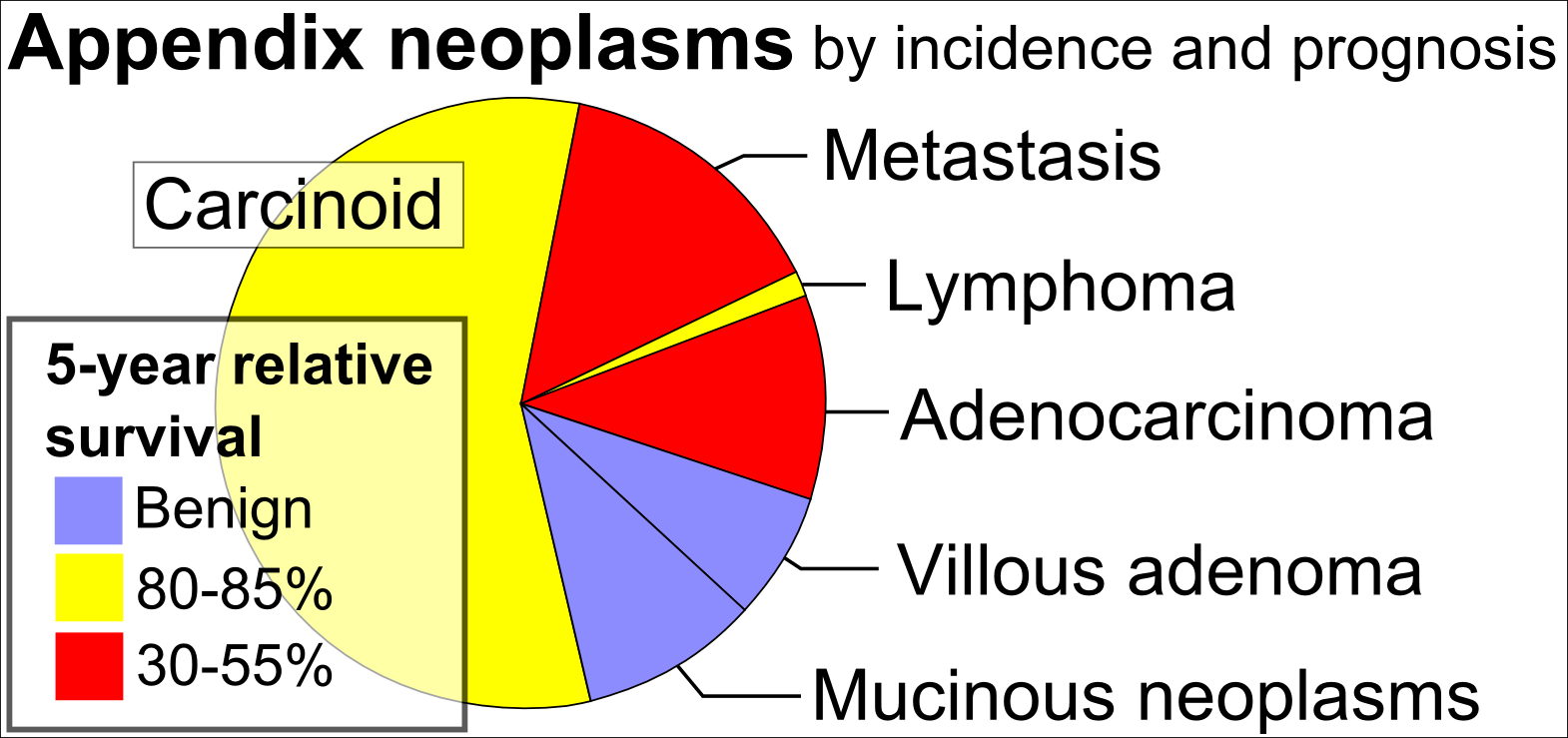 카르시노이드는 창자에 생기는 신경내분비 종양이다.[48][14] 악성 및 양성을 모두 포함한 카르시노이드의 발생률은 연간 10만 명 중 0.15명으로, 보통 40~50대에 많이 생기며, 전체 환자 중 4분의 3 가량은 종양이 충수에 발생한다. 이유는 알 수 없으나, 여성과 백인의 카르시노이드 발생률이 약간 더 높다.[49][15] 카르시노이드의 5년생존율은 일반적인 경우 70~80%이며, 암이 진행된 경우 12~28%이다.