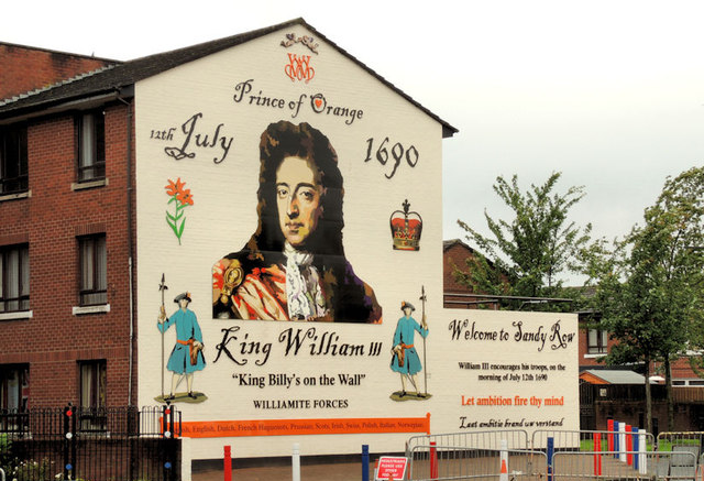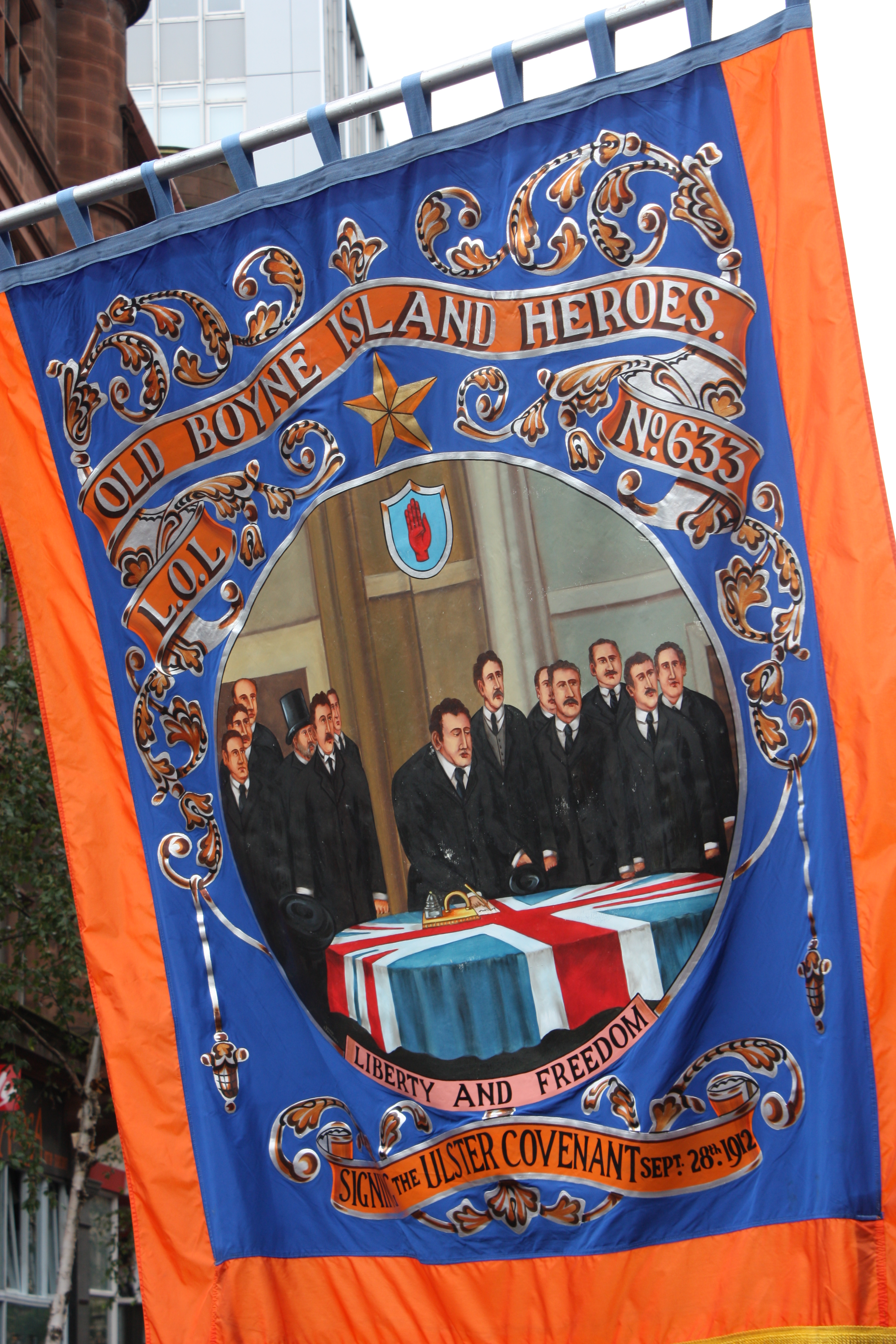 오렌지 교단은 네덜란드 공화국의 Stadtholdernl였으며, 1688년 명예 혁명을 통해 잉글랜드 국왕, 스코틀랜드 국왕, 아일랜드 국왕이 된 오렌지공 윌리엄이 프로테스탄트에게 부여한 시민적, 종교적 특권을 기념하는 단체이다. 교단은 1690년대 초 아일랜드의 윌리엄 전쟁 동안 윌리엄 3세와 그의 군대의 승리, 특히 보인 전투를 정기적으로 기념한다. 오렌지단의 이름은 1688년 명예혁명의 시작과 잉글랜드에 윌리엄 3세의 상륙을 기념하는 오렌지 협회에서 유래되었다.[105] 오렌지단의 깃발은 보인 표준 및 오렌지 표준으로 알려져 있으며, 주황색 바탕에 보라색 별과 왼쪽 상단에 성 조지 십자가가 있다.[106] 오렌지색은 오렌지 왕가를 상징한다.