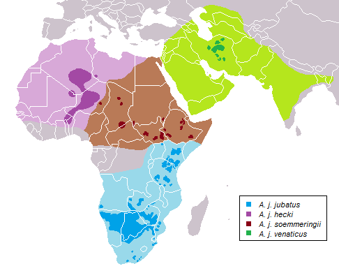 Acinonyx jubatus hecki Hilzheimer, 1913[214][215] | 알제리, 니제르, 부르키나파소, 베냉[214]。 가나, 기니, 기니비사우, 코트디부아르, 시에라리온에서는 멸종되었으며, 세네갈, 모로코에서도 멸종된 것으로 생각된다[214]。 기준 산지는 세네갈[214][215]。 |