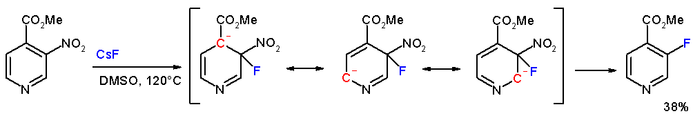 메틸 3-니트로피리딘-4-카르복실레이트 화합물에서 ''메타'' 니트로기는 플루오린에 의해 치환될 수 있으며, 이는 120 °C에서 DMSO에서 세슘 플루오라이드와 반응하여 일어난다.[7]