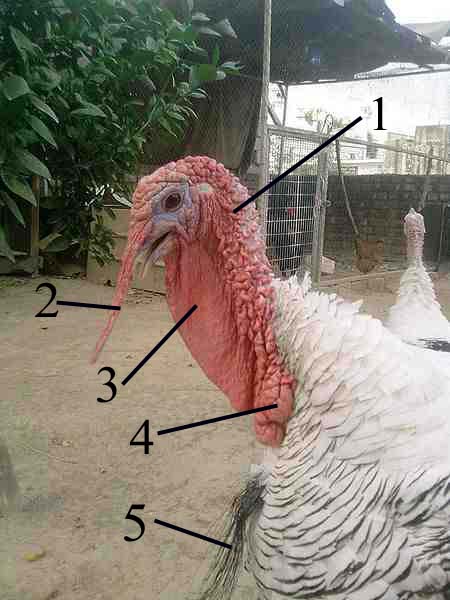 해부학적 용어에서 ''수염''은 칠면조의 이마에 있는 발기 가능한 육질 돌기이다. 칠면조가 이완된 상태일 때는 수염이 옅은 색을 띠며 2cm에서 3cm 정도 길이이다. 하지만 수컷이 과시 행동(구애 행동)을 시작하면 수염에 혈액이 충혈되어 더 붉어지고 수 센티미터 더 길어져 부리 아래로 길게 늘어진다.[41][42]