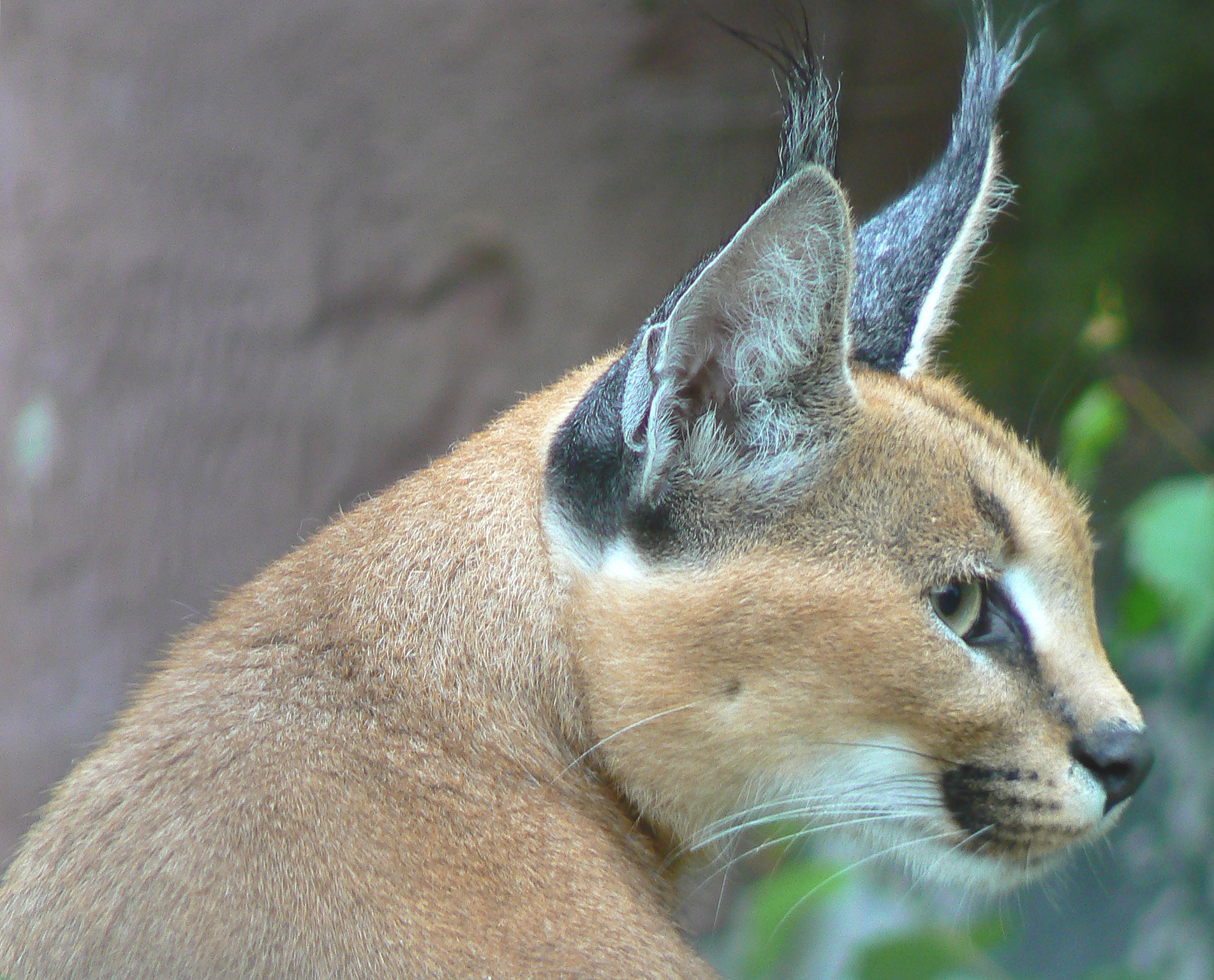 카라칼은 귀 끝에 검은 털이 있는 것이 특징이며, 이 털은 스라소니와 비슷해 보이지만 실제로는 스라소니와 큰 관련이 없다.[76] 몸의 털은 황갈색이나 붉은색을 띠며, 배와 얼굴 일부는 흰색이다. 눈에서 코로 이어지는 검은 줄무늬가 있다.
