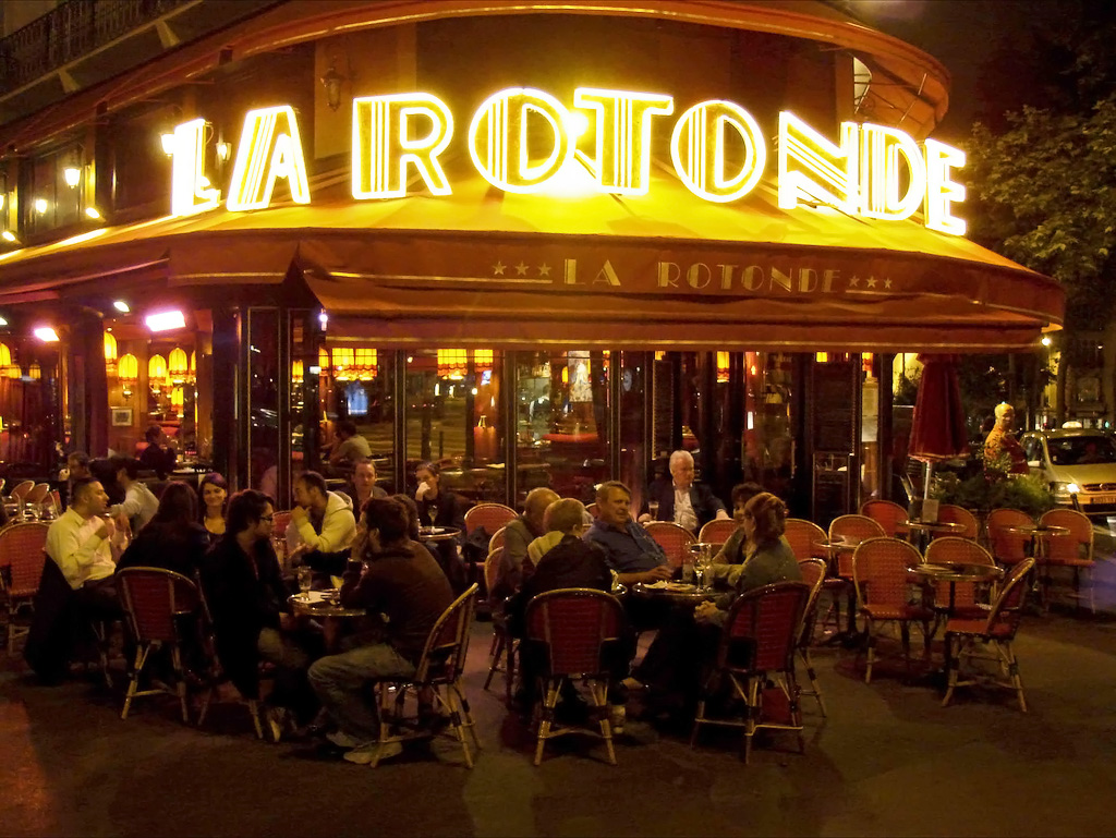 르 돔, 클로즈리 데 릴라스, 라 로통드, 르 셀렉, 라 쿠폴 등 몽파르나스의 카페와 비스트로, 바는 문화적 아이디어와 관계가 생겨나고 숙고되는 만남의 장소였다. 몽파르나스의 밤 문화를 중심으로 한 카페는 현재 파블로 피카소 광장으로 개명된 카르푸 바뱅에 있었다.몽파르나스 전성기(1910년부터 1920년까지)에는 위에 언급된 카페들은 배고픈 예술가들이 몇 생팀으로 저녁 내내 테이블을 차지할 수 있는 장소였다.[2] 잠이 들면 웨이터들은 그들을 깨우지 말라는 지시를 받았다.[2] 논쟁은 흔했고, 일부는 지성에 의해, 다른 일부는 술에 의해 불이 붙었으며, 싸움이 일어나면(그리고 종종 그랬다) 경찰은 절대 소환되지 않았다.[2] 계산서를 지불할 수 없다면, 라 로통드의 주인인 빅토르 리비옹과 같은 사람들은 종종 드로잉을 받아 예술가가 지불할 때까지 보관했다. 따라서 카페 벽에는 미술 작품이 흩어져 있는 때가 있었다.