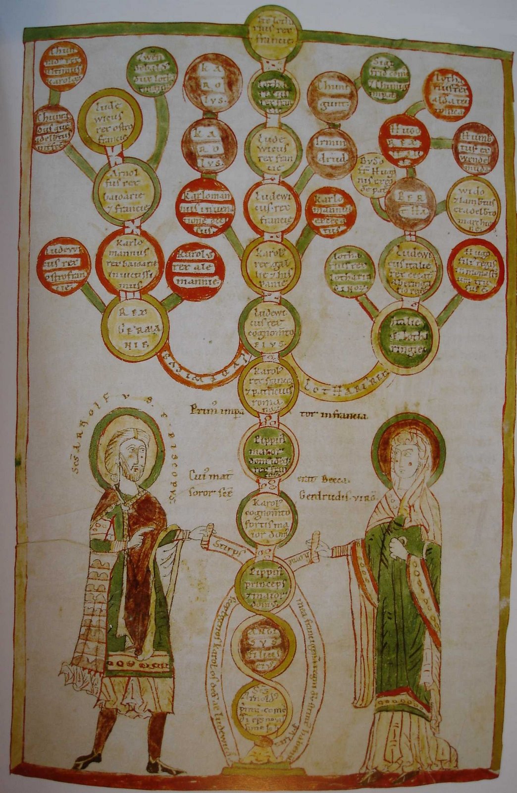 가운데가 카를 2세의 라인으로 가운데 가지의 세 번째 오른쪽이 카를로마누스 2세다. 카를로마누스 2세의 뒤로 아들 카롤루스와 손자 카롤루스가 있다.