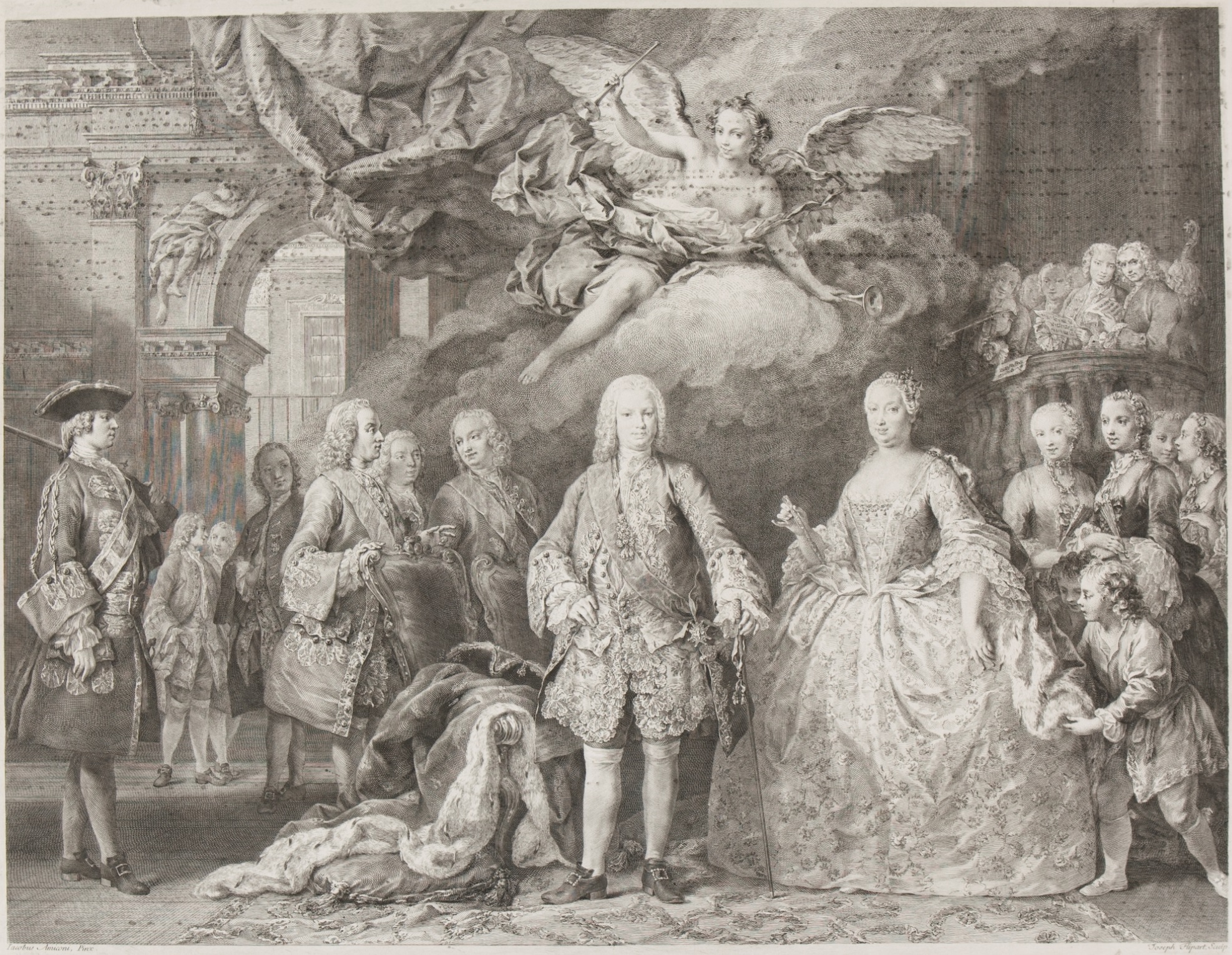 아미고니의 잃어버린 것으로 여겨지는 그림을 바탕으로 한 판화, ''페르난도 6세와 바르바라 데 브라간자의 궁정''.