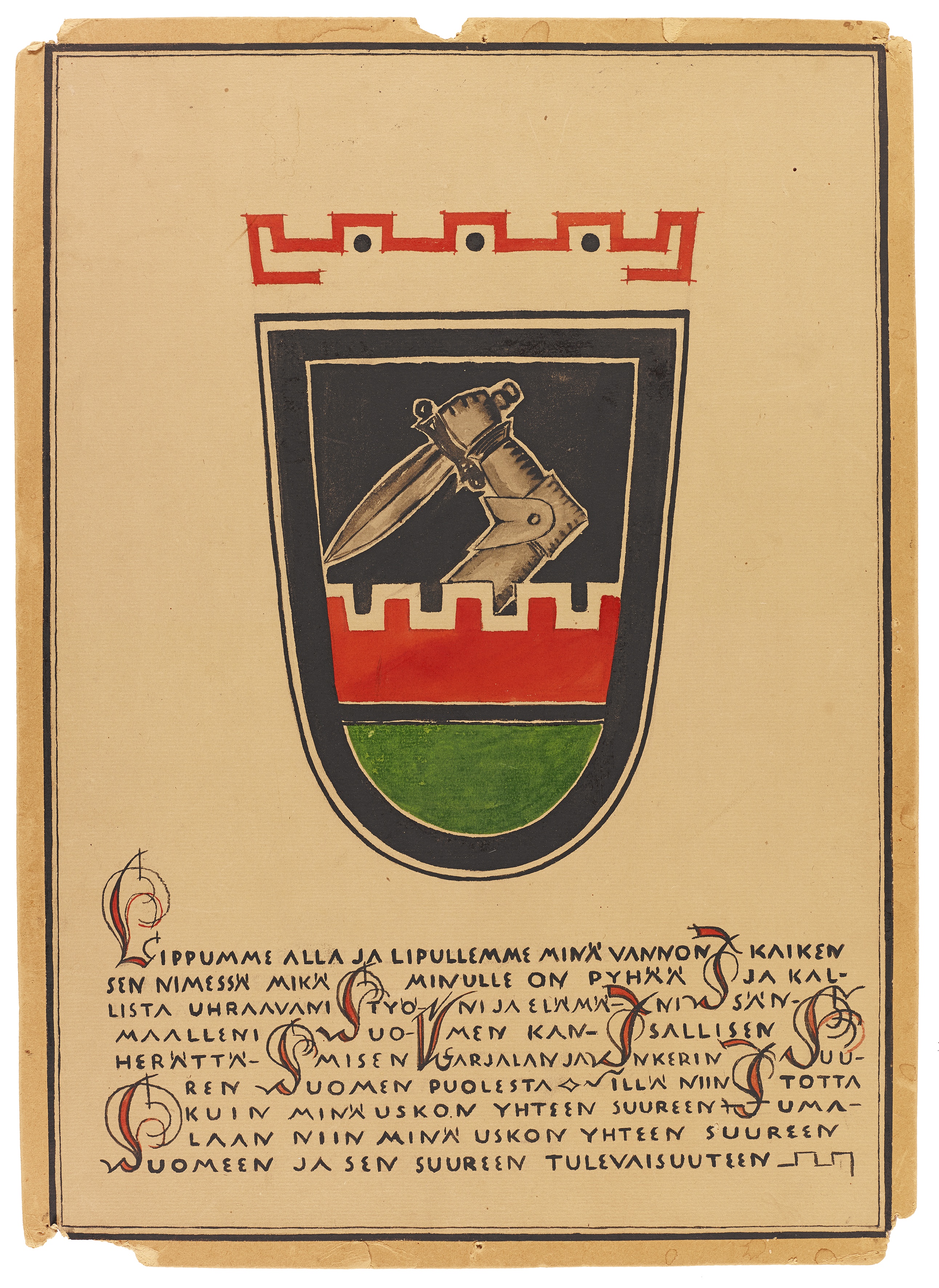 나는 나의 조국, 핀란드 민족 각성, 카렐리아와 잉그리아, 대핀란드를 위해 나의 일과 생명을 바치겠다고, 나의 깃발 아래에서, 그리고 나에게 신성하고 소중한 모든 것을 걸고 맹세합니다. 내가 한 위대한 신을 믿는 것처럼, 나는 대핀란드와 그 위대한 미래를 믿습니다.