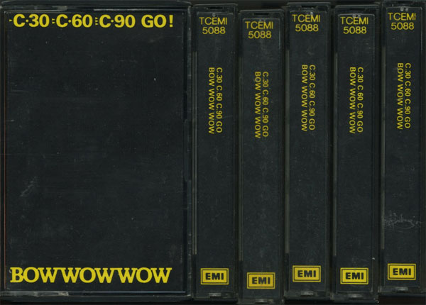 영국에서 나온 바우 와우 와우의 데뷔 싱글 "C·30 C·60 C·90 Go"이 첫 카세트 싱글 곡이며,[5] 미국 최초의 카세트 싱글은 1982년에 나온 고고스의 "Vacation"이다.[6] 바우 와우 와우의 데뷔 싱글 "C·30 C·60 C·90 Go" (카탈로그 번호 TCEMI 5088)는 1980년 영국의 EMI에서 발매된 세계 최초의 카세트 싱글이었다.[1] 미국에서는 1982년 A&M 레코드와 I.R.S. 레코드가 the Go-Go's의 "Vacation"을 발매했는데, 이 싱글은 테이프 양면에 두 곡이 수록되어 있었다.[2][3]