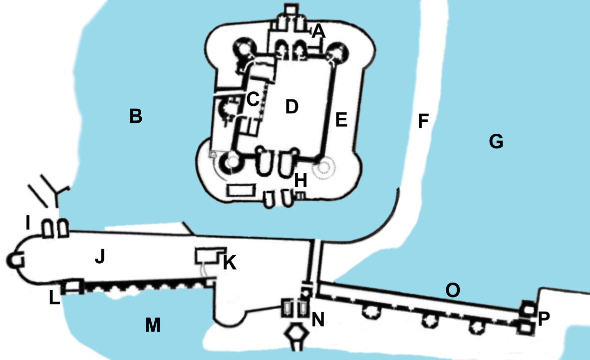 중앙 섬 너머에는 서쪽 섬이 있었고, 아마도 도개교로 연결되었을 것이다.[76] 이 섬은 웨일스어로 "Y Weringaer" 또는 "Caer y Werin"이라고 불리며, 이는 "사람들의 요새"를 의미하며 분쟁 중에 카에르필리 마을에서 보호용으로 사용되었을 수 있다.[82]