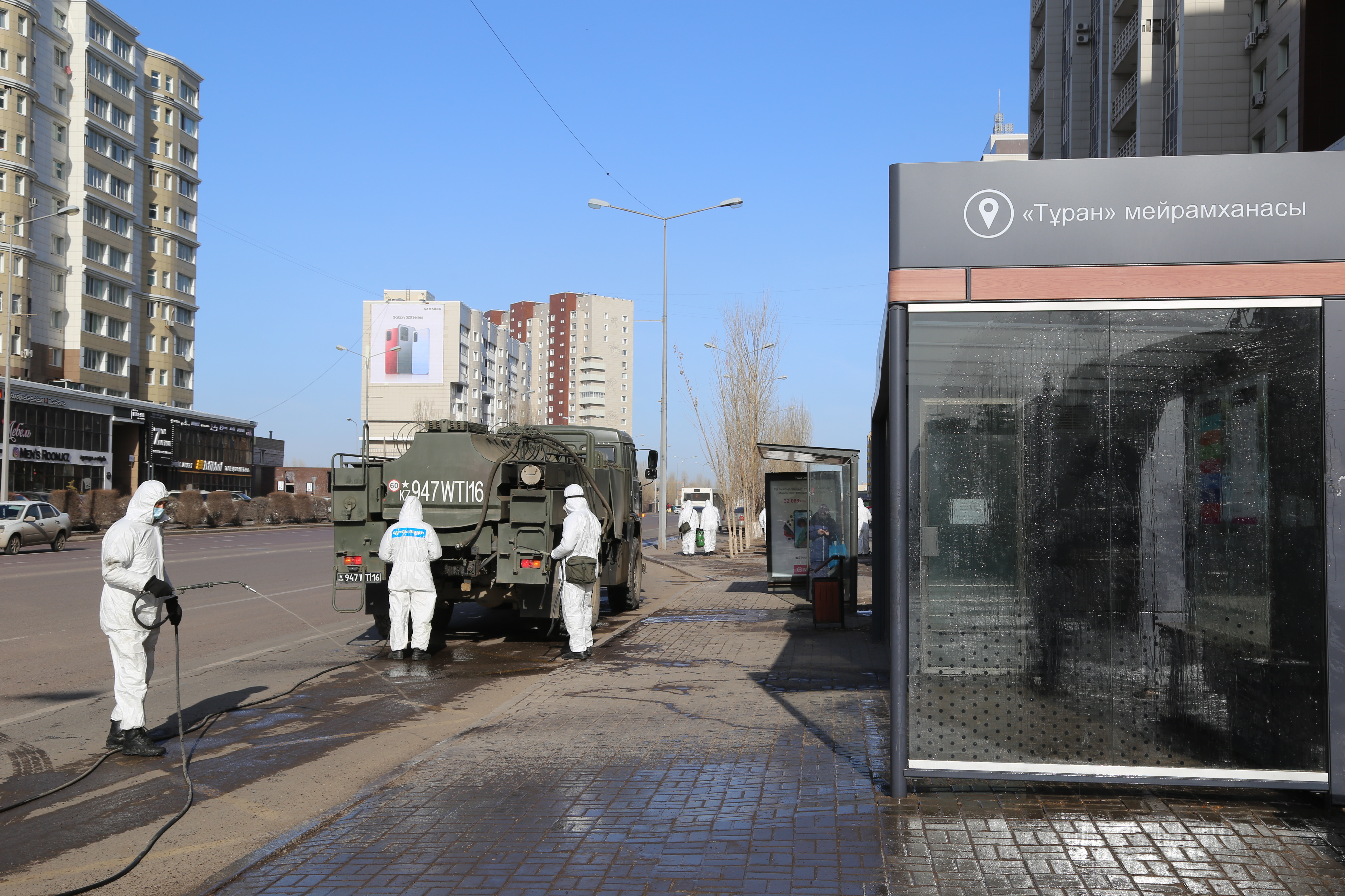 카자흐스탄 군대 군인들이 2020년 3월 26일 아스타나 거리 소독