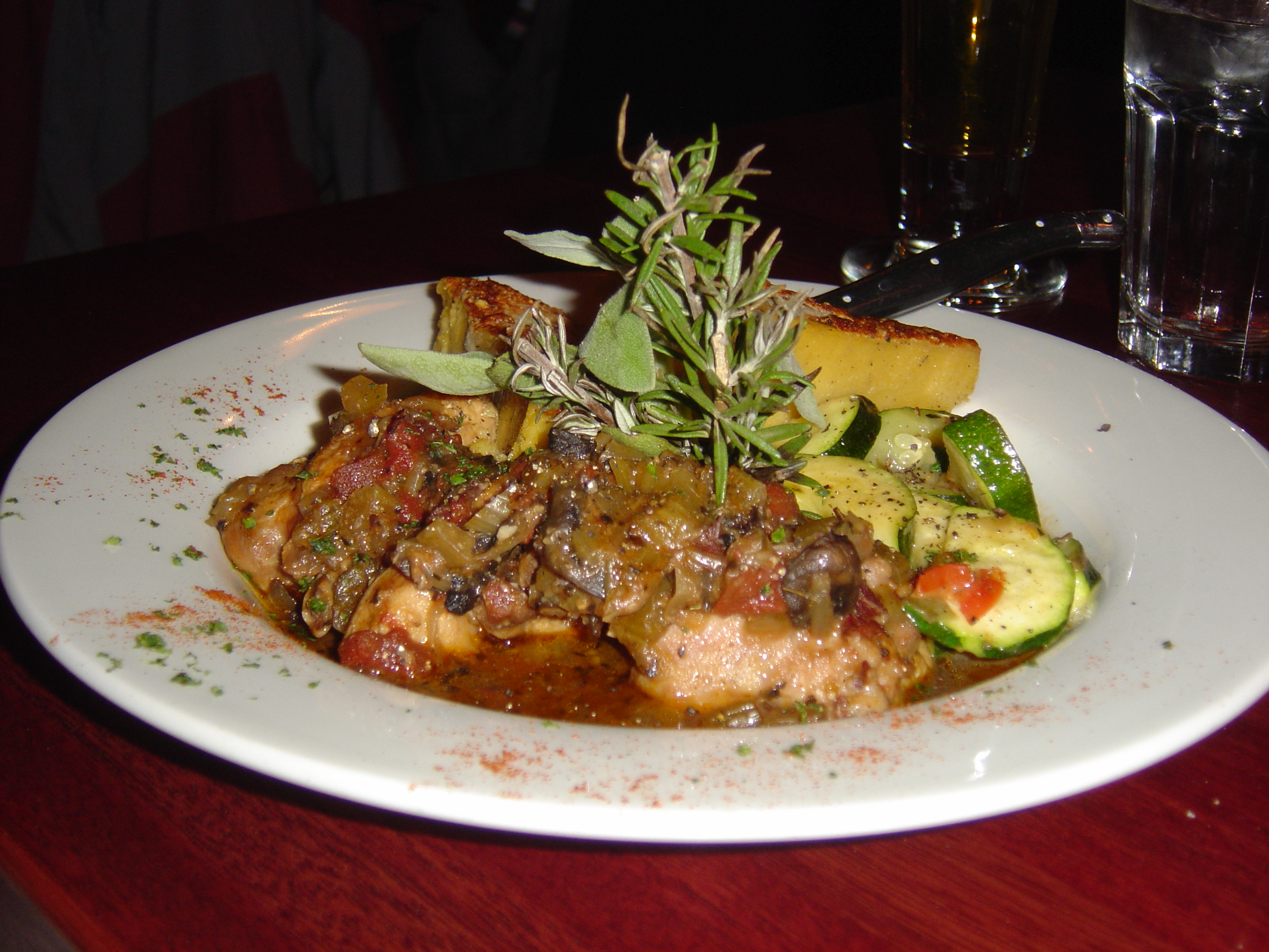 주재료 | 닭 허벅지 밀가루 올리브유 양파 다진 붉은 피망 자두 토마토 녹색 올리브 케이퍼 다진 신선한 마늘 고추 레드/화이트 와인 닭 육수 타임 신선한 바질 오레가노 |