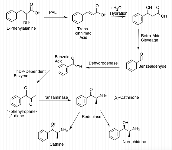 카트 식물에서 카티논 합성은 L-페닐알라닌에서 시작된다. 첫 단계는 L-페닐알라닌 암모니아 분해효소(PAL)에 의해 암모니아기가 제거되고 탄소-탄소 이중 결합이 생성되어 계피산이 형성되는 과정이다.[18] 이후 계피산은 베타 산화 경로 또는 비-베타 산화 경로를 통해 각각 벤조일-CoA 또는 벤조산을 생성한다.[18] 이 두 분자는 티아민 피로인산 의존성 효소(ThDP 의존성 효소)에 의해 촉매되는 축합 반응을 통해 피루브산과 함께 CO2를 생성하여 1-페닐프로판-1,2-디온으로 전환된다.[18] 1-페닐프로판-1,2-디온은 트랜스아미나제 반응을 거쳐 케톤이 암모니아기로 대체되면서 (S)-카티논이 만들어진다. (S)-카티논은 환원 반응을 통해 덜 강력하지만 구조적으로 유사한 카틴 또는 노르에페드린으로 전환될 수 있으며, 이들 또한 식물에서 발견된다.[18]