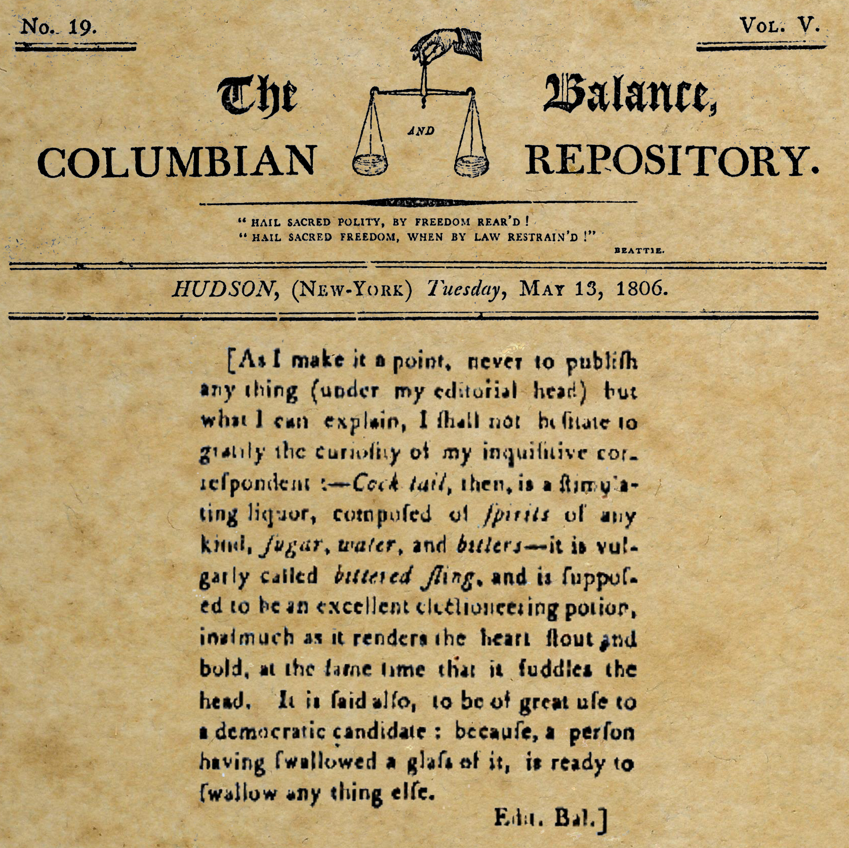 알코올 음료로서 칵테일의 정의가 처음으로 등장한 것은 1806년 5월 13일 ''The Balance and Columbian Repository''(뉴욕주 허드슨(Hudson, New York))이다.[16] 편집자 해리 크로스웰(Harry Croswell)은 "칵테일이란 무엇인가?"라는 질문에 다음과 같이 답했다.
