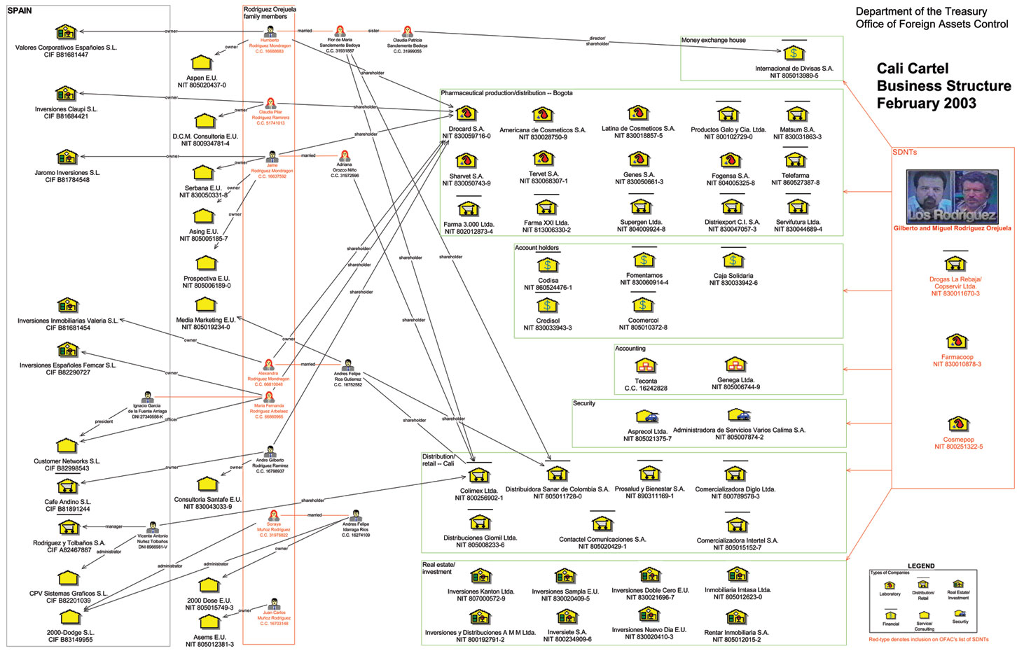 1980년대 자금 세탁에 대한 사법 당국의 감시가 강화되자, 칼리 카르텔은 미국 달러로 내구 소비재를 구입하여 콜롬비아에 밀수입한 후 현지 통화인 페소로 판매하는 방식을 사용했다. 파블로 에스코바르의 메데인 카르텔이 1993년에 붕괴된 후, 칼리 카르텔은 콜롬비아산 코카인의 80%를 장악하고 연간 추정 90억달러의 수익을 올렸다.