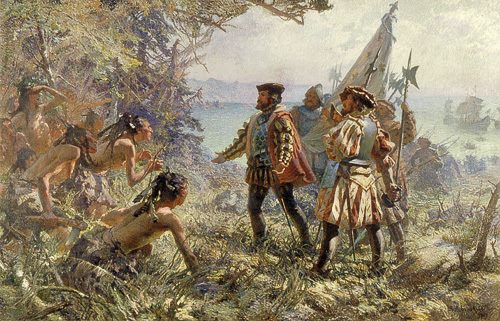 자크 카르티에가 이로쿼이와 스타다코나에서 만나는 모습. 카르티에의 일행 중 한 명이 프랑스 왕실 깃발을 들고 있다.