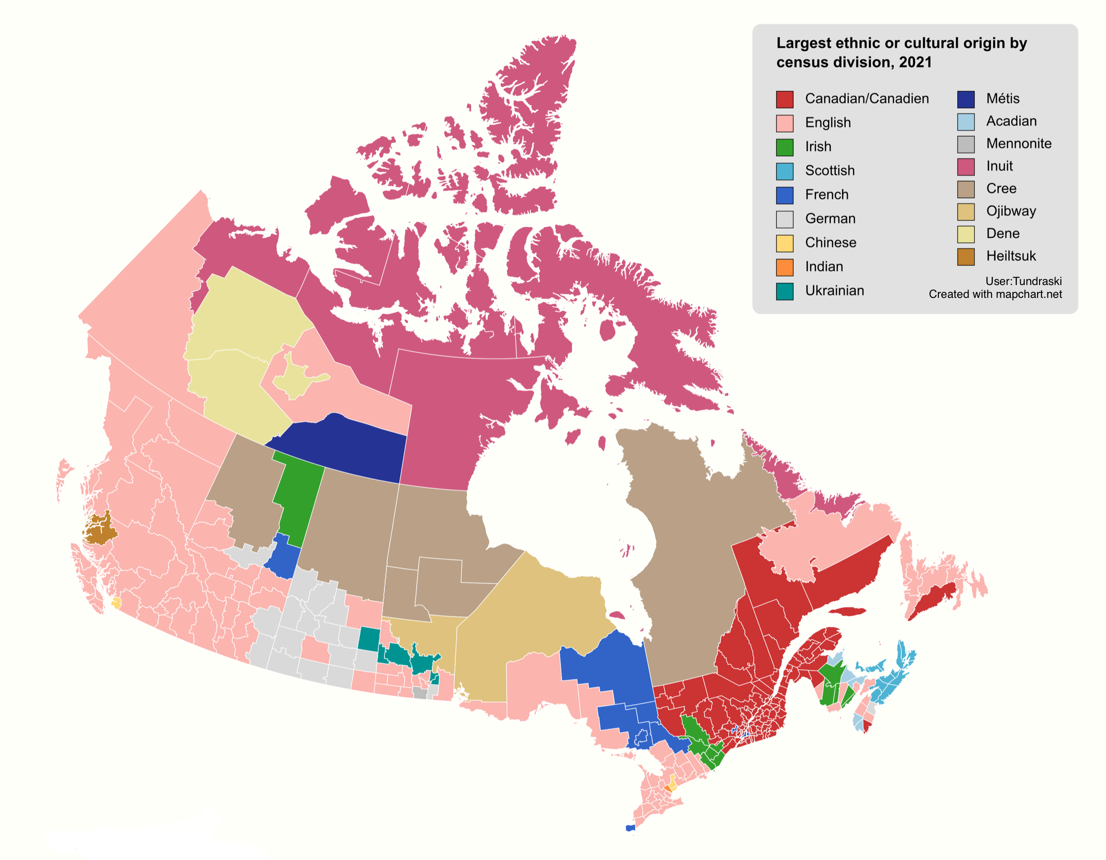 2011년 조사 기준으로 주요 민족 집단을 보면, 잉글랜드계가 21%, 프랑스계(퀘백 주)가 15.8%, 스코틀랜드계가 15.1%를 차지했다.[67] 같은 해 기준으로 대륙별 민족 구성을 보면, 유럽계가 76.7%로 가장 많았고, 아시아계 14.2%, 캐나다 원주민계 4.3%, 아프리카계 2.9%, 라틴아메리카계 1.2%, 다인종계 0.5%, 기타 0.3% 순으로 나타났다. 이누이트계 주민은 캐나다 북부의 노스웨스트 준주, 누나부트 준주, 유콘 준주에 상대적으로 높은 비율로 거주하고 있다.