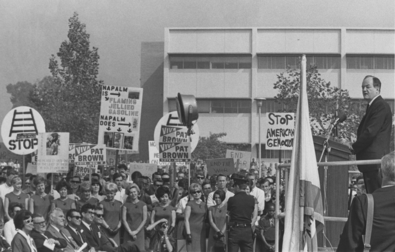 캘리포니아 주립 대학교 노스리지(CSUN)의 설립은 1952년, 로스앤젤레스 주립 대학교(현재 캘리포니아 주립 대학교 로스앤젤레스)의 새로운 분교를 발드윈힐스에 설립하자는 제안과 함께 시작되었다.[11][15] 그러나 샌 페르난도 밸리 지지자들은 윌셔 대로에 있는 브라운 더비 레스토랑에서 열린 회의 후, 주 관계자들을 설득하여 위치를 노스리지로 변경했다.[11][15] 샌 페르난도 밸리 주립 대학교의 기원은 1955년 9월로 거슬러 올라가며, 당시 샌 페르난도 고등학교에서 임대된 10개의 교실에서 처음으로 수업이 시작되었다.[16] 1956년 1월 4일, 대학교의 공식 기공식이 열렸으며, 캘리포니아 주지사 굿윈 나이트와 로스앤젤레스 주립 대학교 총장 하워드 S. 맥도날드 등이 참석했다.[15] 현재는 교외 지역에 위치하고 있지만, 설립 당시에는 여러 농지가 건설을 위해 정리되어야 했던 농촌 지역이었다.[15]2. 2. 격동의 시대 (1966-1972)