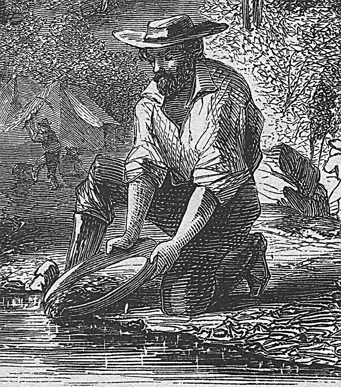 캘리포니아의 사금층에 포함된 금 함유율이 매우 높았기 때문에, 초기 포티나이너스(Forty-Niners)는 강이나 작은 강에서 사금 채취(panning)를 하는 것만으로도 충분했다.[246] 그러나 사금 채취는 대규모로 할 수 없었기 때문에, 근면한 광부들과 광부 집단은 더 많은 양의 사금을 처리하기 위해 "요람(Cradle)", "로커(Rockers)", "롱톰(Long Tom)"을 사용했다.[247][248]복잡한 금 채취 방법은 대부분 탐광자 집단이 강 전체의 물을 강 옆의 수로로 돌리고, 새로 드러난 강바닥에서 금을 찾는 방식이었다.[249] 미국 지질 조사소의 현대 추정에 따르면, 골드 러시 초기 5년 동안 1,200만 온스[250](370톤)의 금이 채취되었으며, 이는 2006년 11월 가치로 약 70억달러에 해당한다.[251]