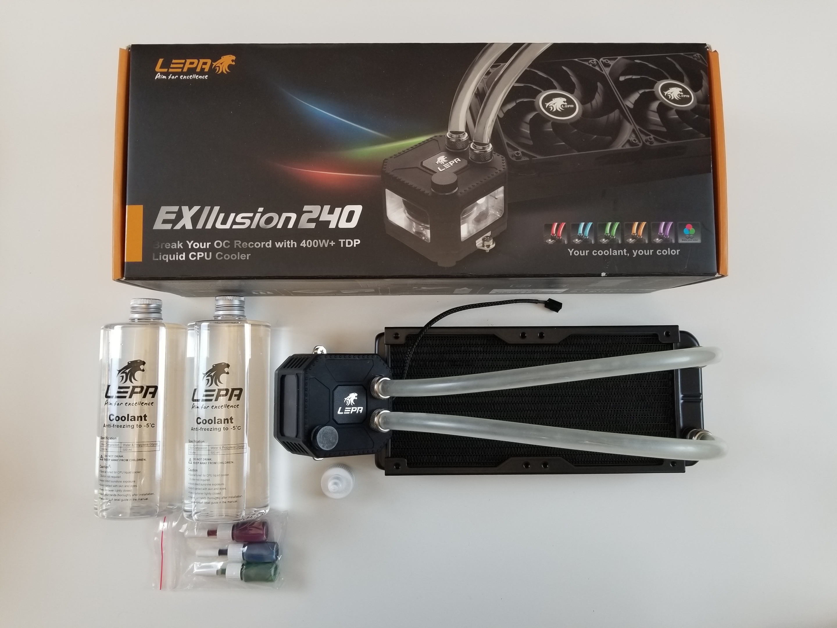 수냉 키트 일식 - 사용자가 수냉 경로를 조립하거나 냉각수를 다룰 필요가 없다.