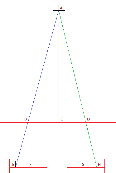 첨부된 다이어그램에서 두 카메라 렌즈 중심 사이의 거리는 ''BD = BC + CD''이다. 삼각형은 다음과 유사하다.