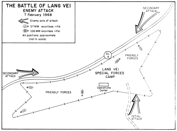 1968년 2월 7일 새벽, 북베트남군은 랑베이에 주둔한 특수 부대 캠프를 공격했다. 미군은 라오스 난민과 SOG 정찰팀을 통해 이 지역에 북베트남군 장갑차량이 있다는 정보를 사전에 입수했으나,[61] 실제로 장갑 부대를 투입할 것이라고는 예상하지 못했다.[25]북베트남군은 소련제 PT-76 수륙 양용 전차 12대를 앞세워 공격을 개시했다. 이 전차들은 203 장갑 연대 소속이었으며, 보병 부대(304 사단의 7대대, 66 연대 및 24 연대 4대대)의 지원을 받았다.[25] 보병들은 사첼 폭탄, 최루탄, 화염 방사기 등으로 무장하고 있었다.
