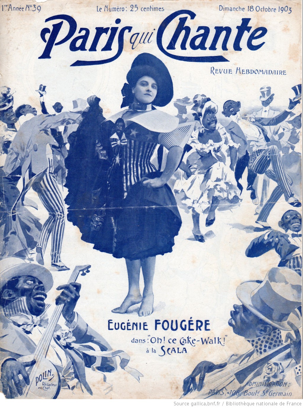 프랑스 가수이자 무용수인 외제니 푸제르(Eugénie Fougère)는 1899년 뉴욕 극장에서 "헬로, 마 베이비(Hello, Ma Baby)"를 추는 모습이 촬영되었다.[38] 그녀는 1900년 마리뉴 극장(Théâtre Marigny)에서 파리(Paris)(프랑스)에 이 춤을 소개했다.[39] "케이크워크"는 빠르게 인기를 얻었고, 1903년 몇 달 동안 파리는 '케이크워크 열풍'(folie du cake-walk)에 사로잡혔다.[40]