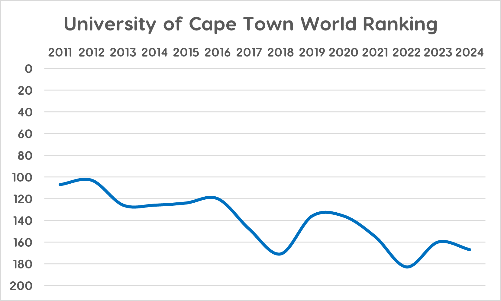 케이프타운 대학교(UCT)는 고등교육 분야에서 아파르트헤이트에 대한 지속적인 저항으로 인해 "언덕 위의 모스크바"라는 별명을 얻었다.[9]1920년대에 소수의 흑인 학생들을 처음으로 받아들였다. 1980년대와 1990년대까지 흑인 학생 수는 비교적 적었지만, 대학은 국가의 변화 조짐을 감지하고 환영하며, 의도적이고 계획적인 내부 변혁 과정을 수행하기 시작했다. 1980년대부터 1990년대 초까지, 대학에 입학한 흑인 학생 수는 35% 증가했다. 2004년까지 UCT의 2만 명 학생 중 거의 절반이 흑인이었고, 학생회의 거의 절반이 여성이었다. 오늘날 이 대학교는 남아프리카 공화국에서 가장 다양한 캠퍼스 중 하나를 자랑한다.[10]