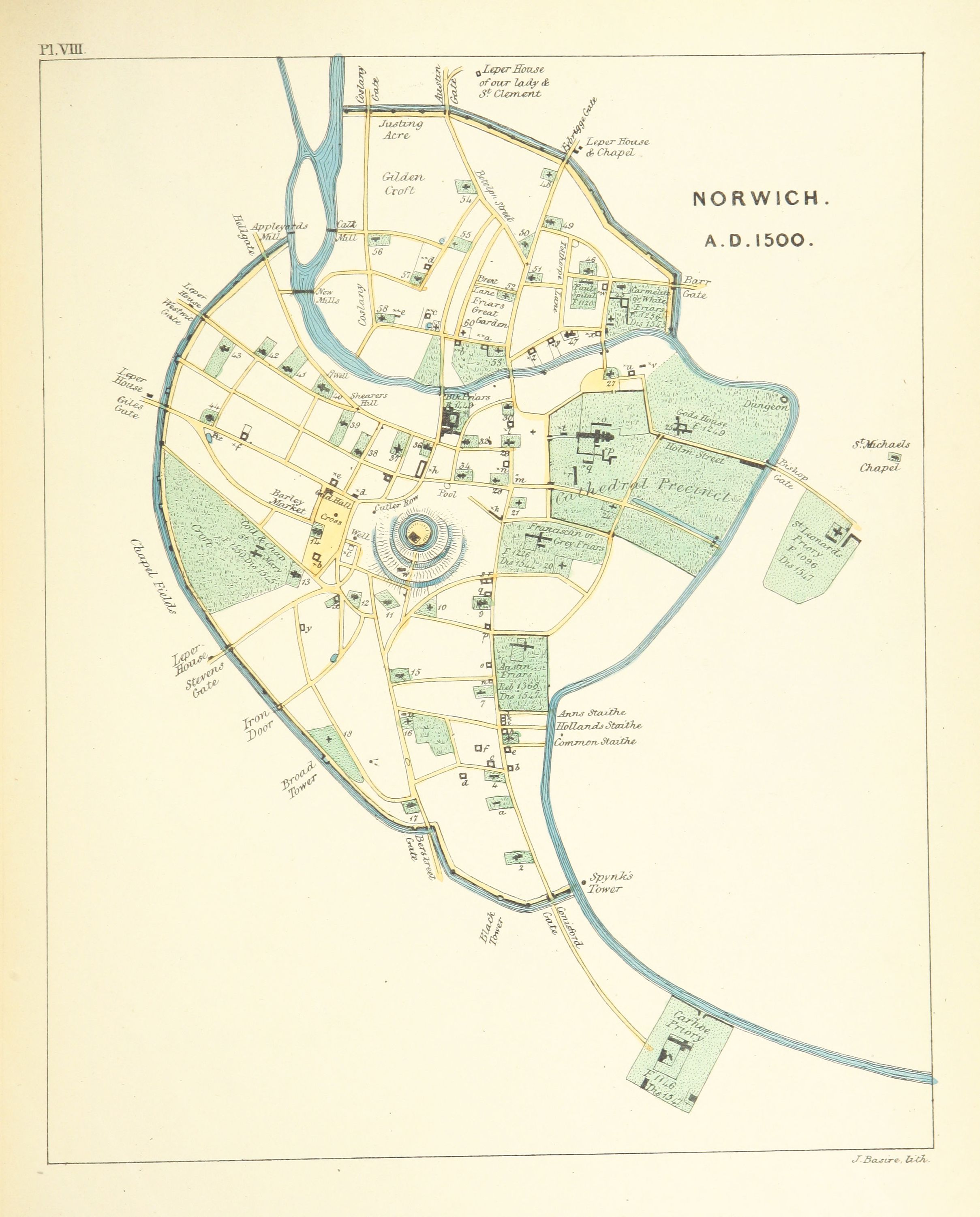 새뮤얼 우드워드의 저서 ''노리치 성의 역사와 고대 유물''(1847)에 실린 16세기 노리치 지도