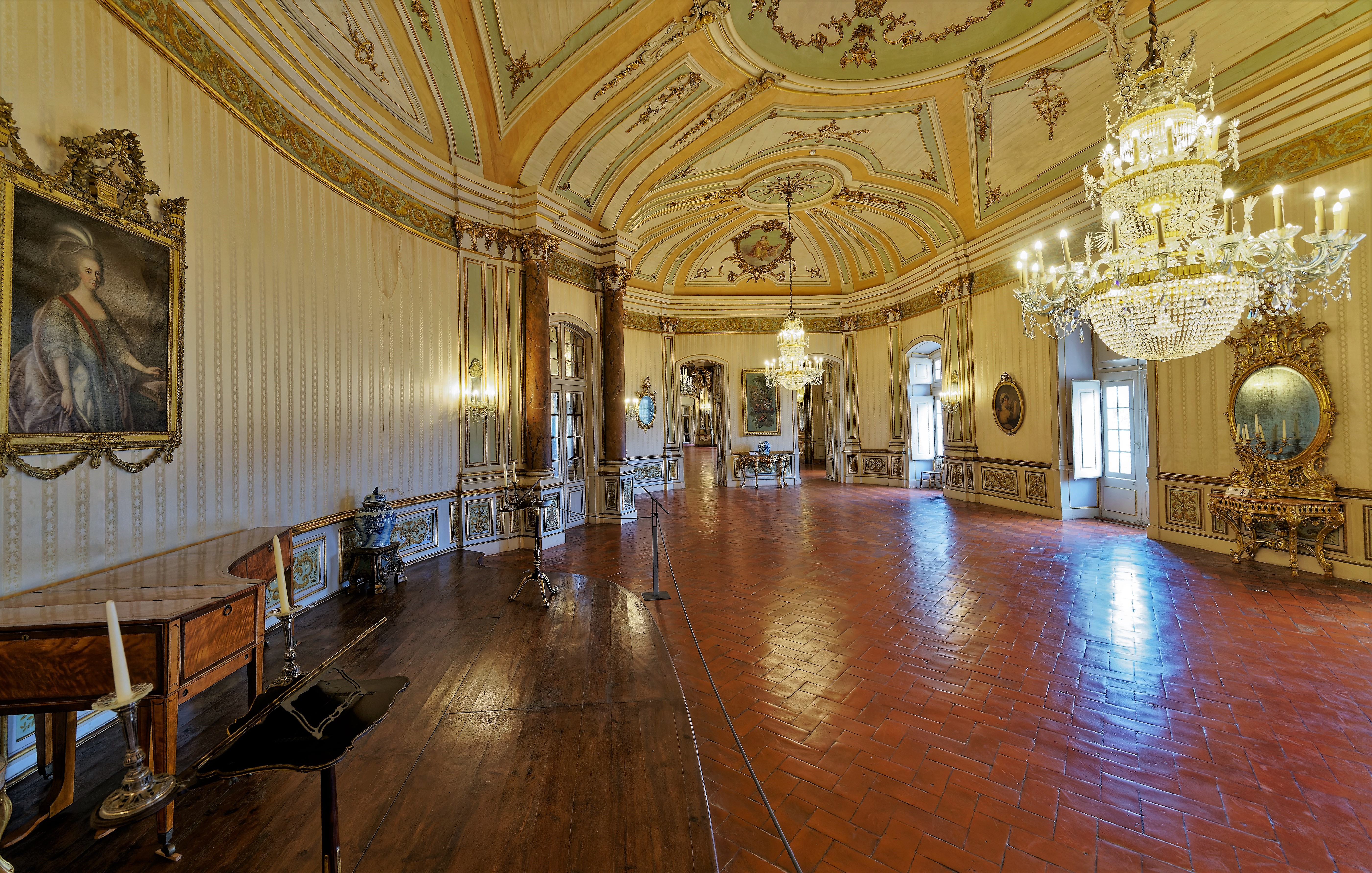 응접실은 대개 거울의 방 혹은 왕좌의 방으로 불리는 곳으로서 1757년 로빌론이 설계하였다. 포르투갈어로는 "살라 도스 엠바샤도르스(Sala dos Embaixadores)"(대사들의 방)라고 불린다.[23] 이 방은 기다랗게 지어졌으며 프란시스쿠 드 멜루가 천정에 마리아 1세 통치 기간 동안 포르투갈 왕족이 콘서트에 참석하는 모습을 묘사한 그림을 그렸다. 방은 매우 넓고 밝으며 궁전의 전체 너비를 가로지르며 양쪽에 높은 창문이 있다. 각 창문 사이에는 반원형 금박 콘솔 테이블이 있고, 그 위에는 크리스탈 벽걸이 램프로 장식된 피어 글라스가 있다. 앱스에 설치된 왕좌 다이는 금박을 입힌 거울 기둥으로 둘러싸여 있으며, 바닥은 흑백 대리석 타일의 체커보드 패턴이다.[23]4. 1. 3. 음악실