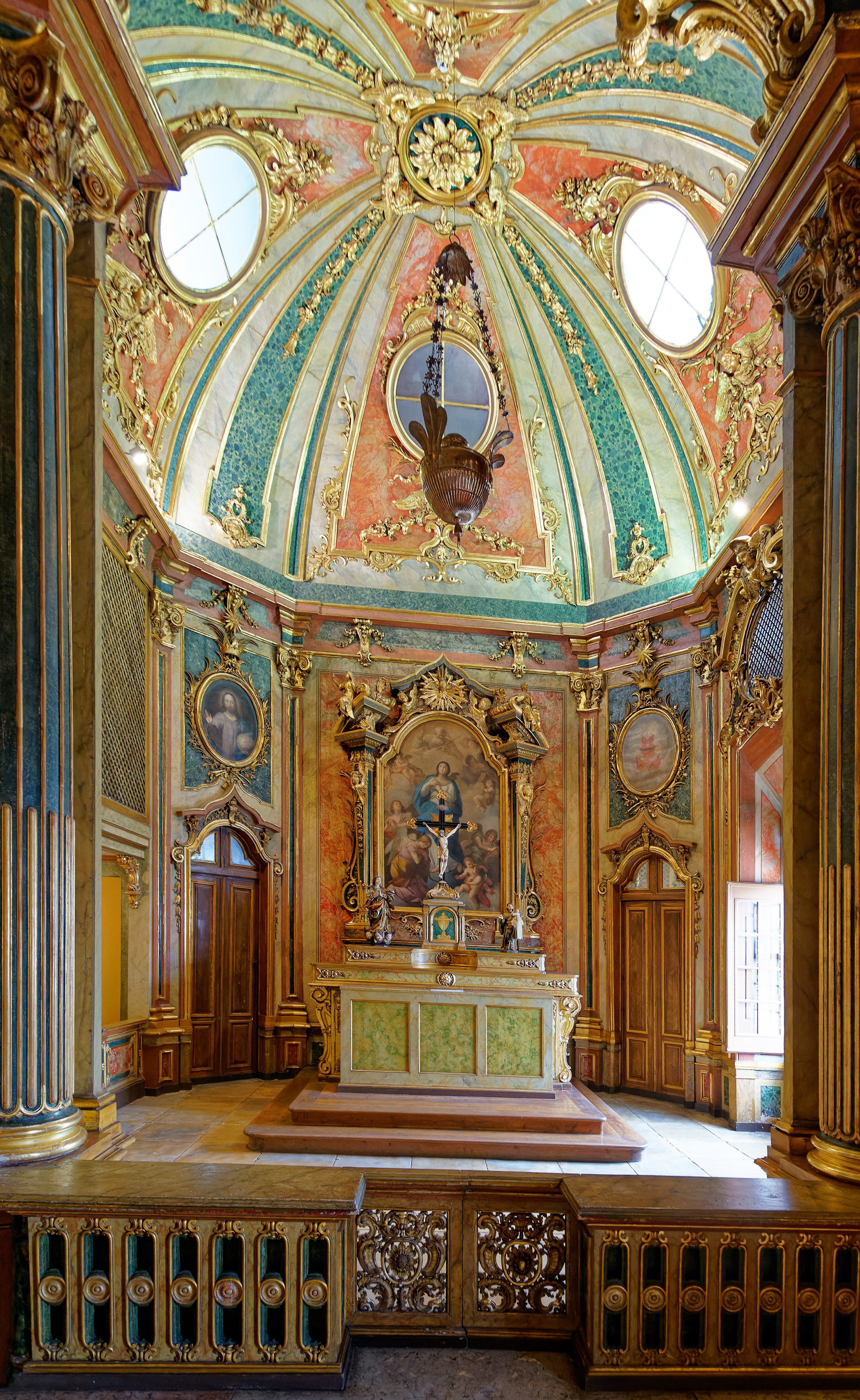 페드루 3세가 사망한 후, 여왕은 국빈 접견이 종교 의식의 분위기를 띠게 되었다. 여왕의 정신 질환은 심각해졌고 그녀의 종교적 열정은 더욱 커졌다. 상층에는 왕족이 사용할 수 있는 갤러리가 있으며, 그들은 회중과 떨어져 앉았다. 이 갤러리 중 하나에는 작은 로코코 파이프 오르간이 있다. 예배당의 특징은 화려하고 휴대 가능한 세례대이며, 그 대리석 분지는 정교한 로코코 프레임에 놓여 있으며, 조각된 나무 덮개로 덮여 있다.[24]