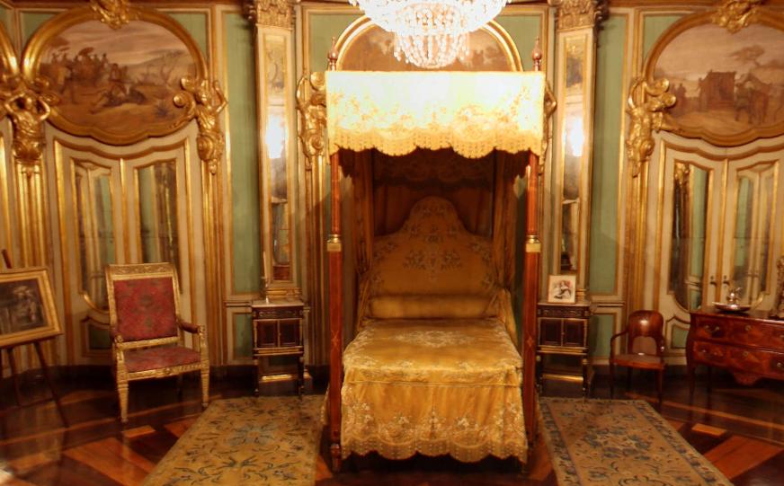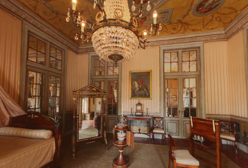 왕의 침실은 궁전에서 가장 "환상적인" 방 중 하나로 묘사되어 왔다. 실제로는 사각형이지만, 거울 유리 기둥으로 지탱되는 돔형 천장으로 인해 완전히 둥근 형태의 환상을 준다. 기둥 사이에는 돈 키호테의 이야기 장면을 묘사한 카르투슈가 있다. 페드루 4세 국왕은 1834년 이 방에서 사망했으며, 그는 1798년 이 방에서 태어났다. 방에는 그의 "늘어진 턱과 매력적이지 않은 얼굴"을 보여주는 국왕의 큰 흉상이 있다.