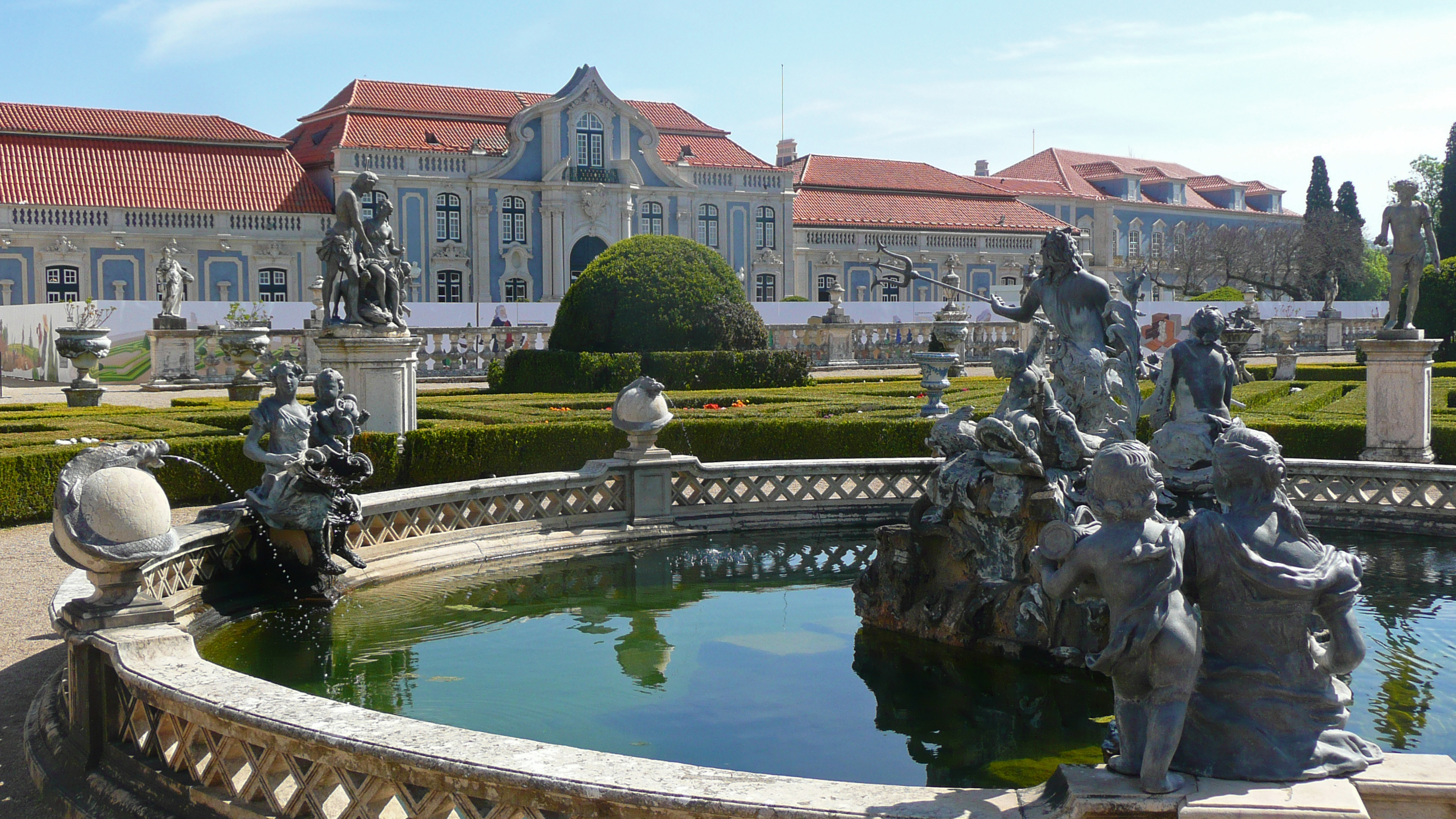 궁전 뒤편에는 앙드레 르 노트르 양식의 토피어리 파테르가 있다. 1760년부터 로빌론을 도운 네덜란드 정원사 헤랄드 판 데르 콜크는 정원의 수로를 포함하여 플랑드르의 영향을 주었다.[28] 조각상과 분수는 테라스와 산책로에 특별한 흥미를 더한다. 주요 파테르의 주요 특징은 ''포르티코 도스 카발리뇨스''인데, 명성을 묘사한 기마상 2개와 18세기 의상을 입은 스핑크스 2개가 있는 정원 사원이다. 이는 공식적인 것과 환상적인 것을 결합한 것이다.[29] 정원 곳곳에는 사비니 여인의 강간과 아벨의 죽음, 인간 의상을 입은 당나귀 조각상 등이 있다. 정원 깊숙한 곳에는 폭포가 있는 동굴이 있는데, 켈루스 폭포는 리스본 근처에 건설된 최초의 인공 폭포였다.