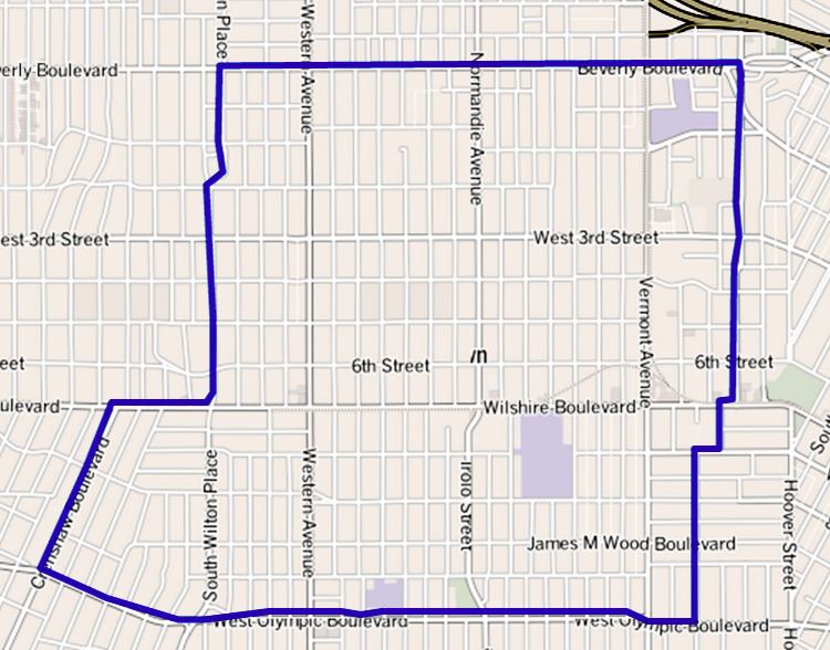 로스앤젤레스 타임스의 매핑 L.A. 프로젝트는 코리아타운의 경계를 북쪽으로는 베벌리대로, 동쪽으로는 Virgil Avenue, Wilshire Place 및 Westmoreland Avenue, 남쪽으로는 올림픽대로, 서쪽으로는 Crenshaw Boulevard 및 Wilton Place로 지정한다. 이 경우 코리아타운에는 윌셔 센터, 윌셔 파크, 파크 마일의 일부가 포함된다.[41]