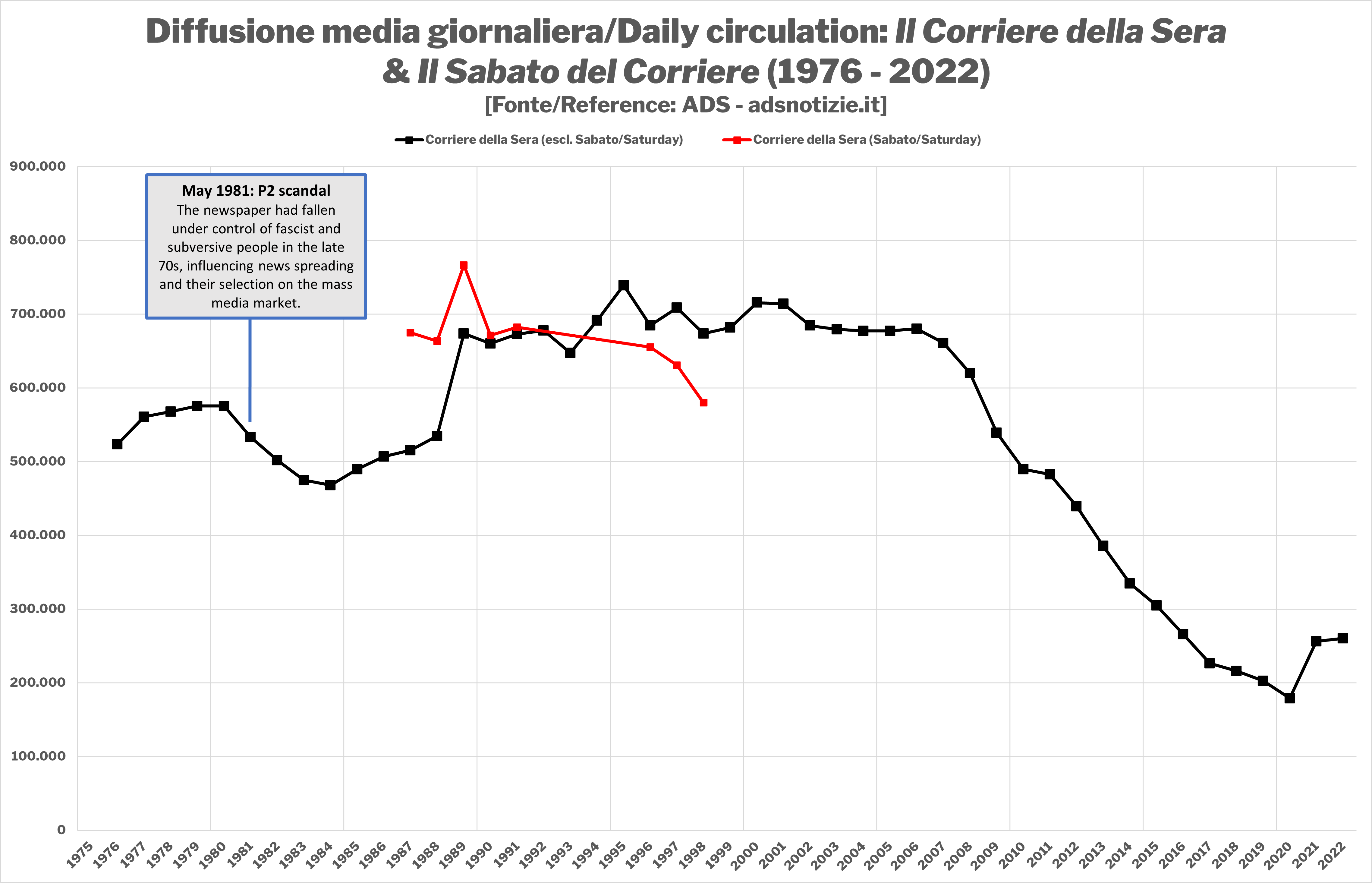 1977년에는 당시 여당이었던 기독교민주당과의 대립으로, 은행으로부터의 융자를 중단당해 자금난에 빠진 모회사 리촐리사(당시)에 대해, 좌파로 알려진 피에로 오토네 편집장을 해고하는 것을 조건으로, 극우 정당인 이탈리아 사회 운동 (MSI)의 간부이자, 전 프리메이슨의 반공 조직인 "로지 P2"의 리치오 젤리 대표가 융자를 제안했다.