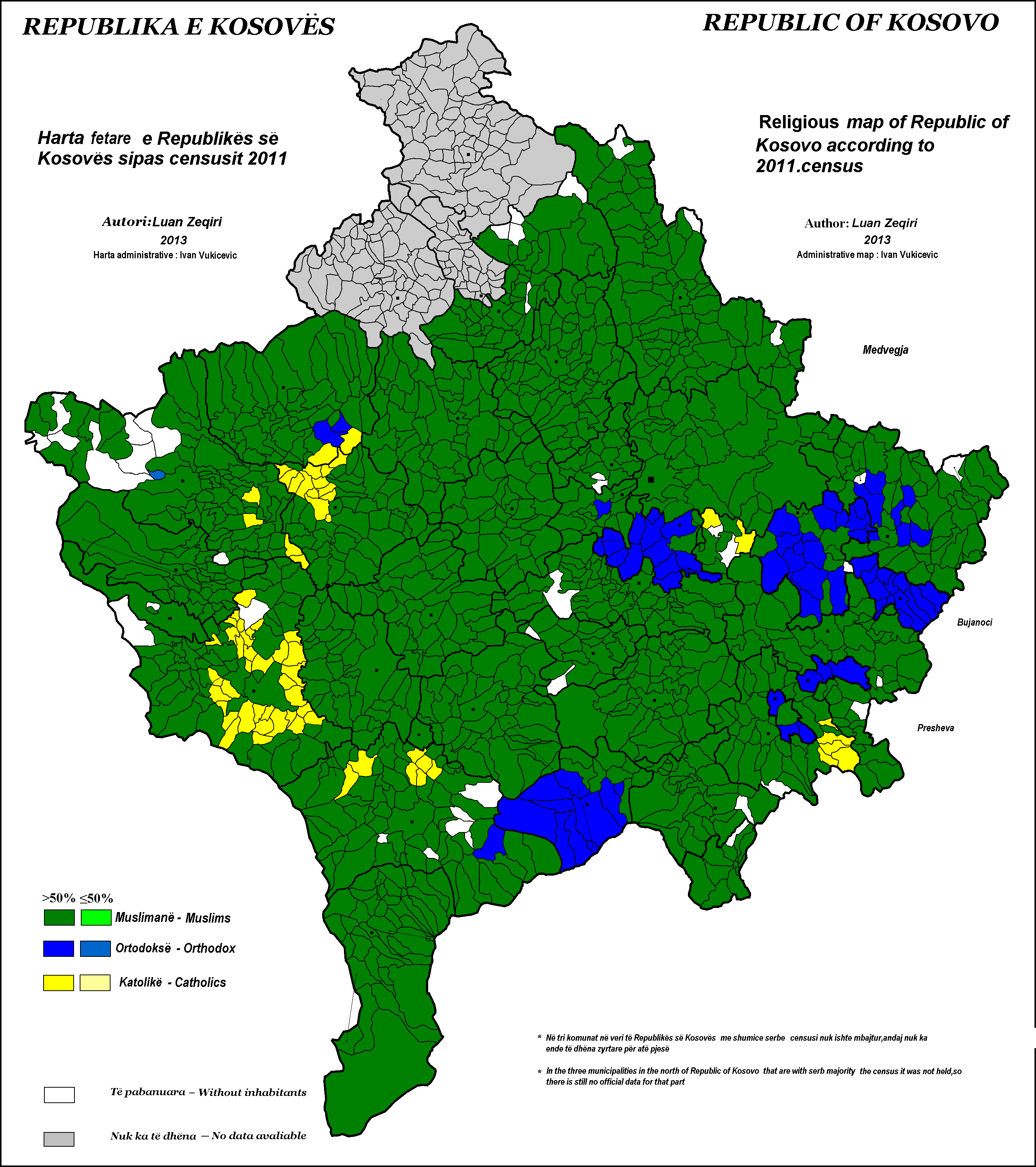 2011년 코소보의 종교 지도 (정착촌별). 북쪽의 세르비아인이 다수인 회색 지역은 정교회가 다수를 차지하는 것으로 추정된다.