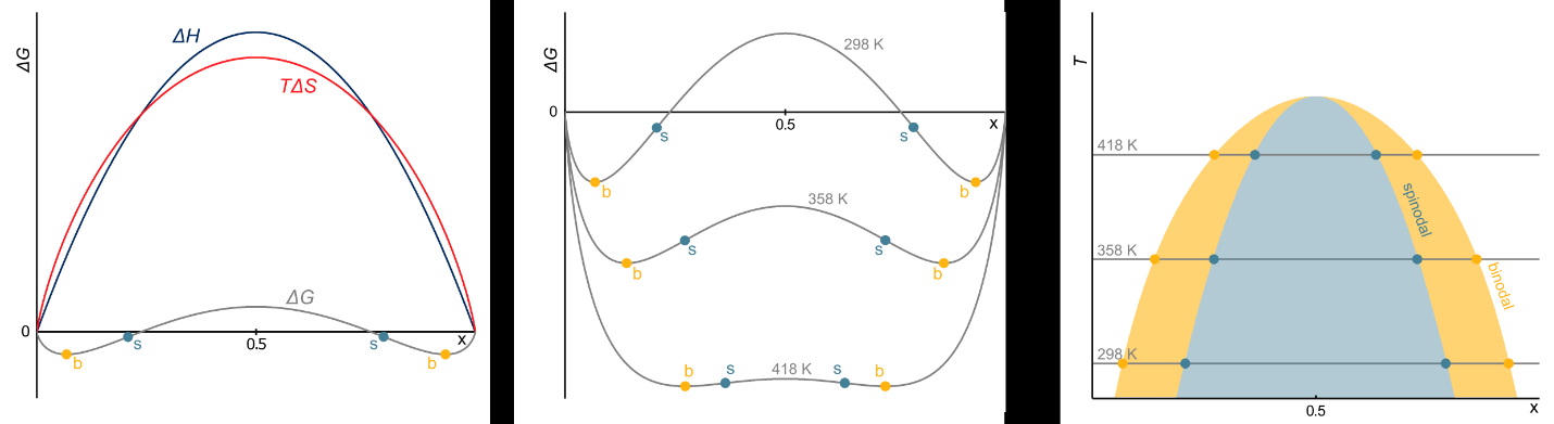 혼합물의 상 평형 그림은 실험적으로 2상 경계 또는 이중선 곡선을 결정하여 예측할 수 있다. 단순한 이론적 접근 방식에서 이중선은 서로 다른 온도(또는 기타 상호 작용 매개변수)에서 탈혼합의 자유 에너지가 최소가 되는 조성이다().[10][11]