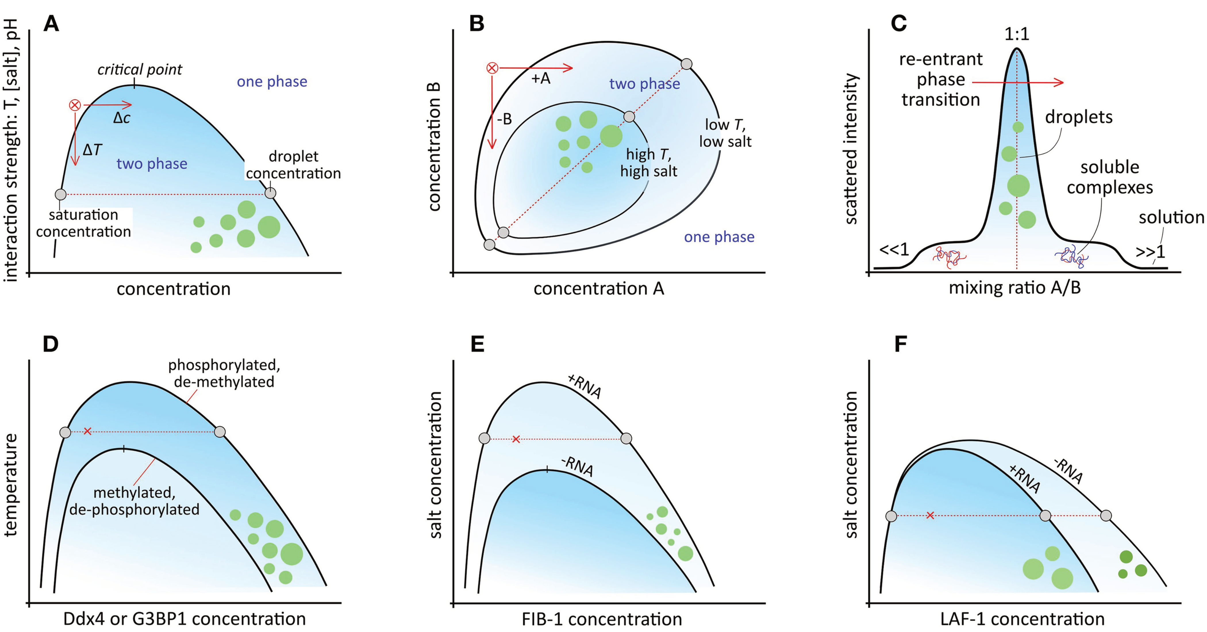 또는 조성에 대한 탈혼합의 자유 에너지 변화를 최소화함으로써(), 스피노달 곡선이 정의된다. 혼합물의 상태가 이 두 곡선 중 어디에 위치하느냐에 따라 상 분리 방식, 즉 코아세르베이트 방울이 생겨나고 성장하는 방식(핵 생성-성장 또는 스피노달 분해)이 결정된다.[10][11]