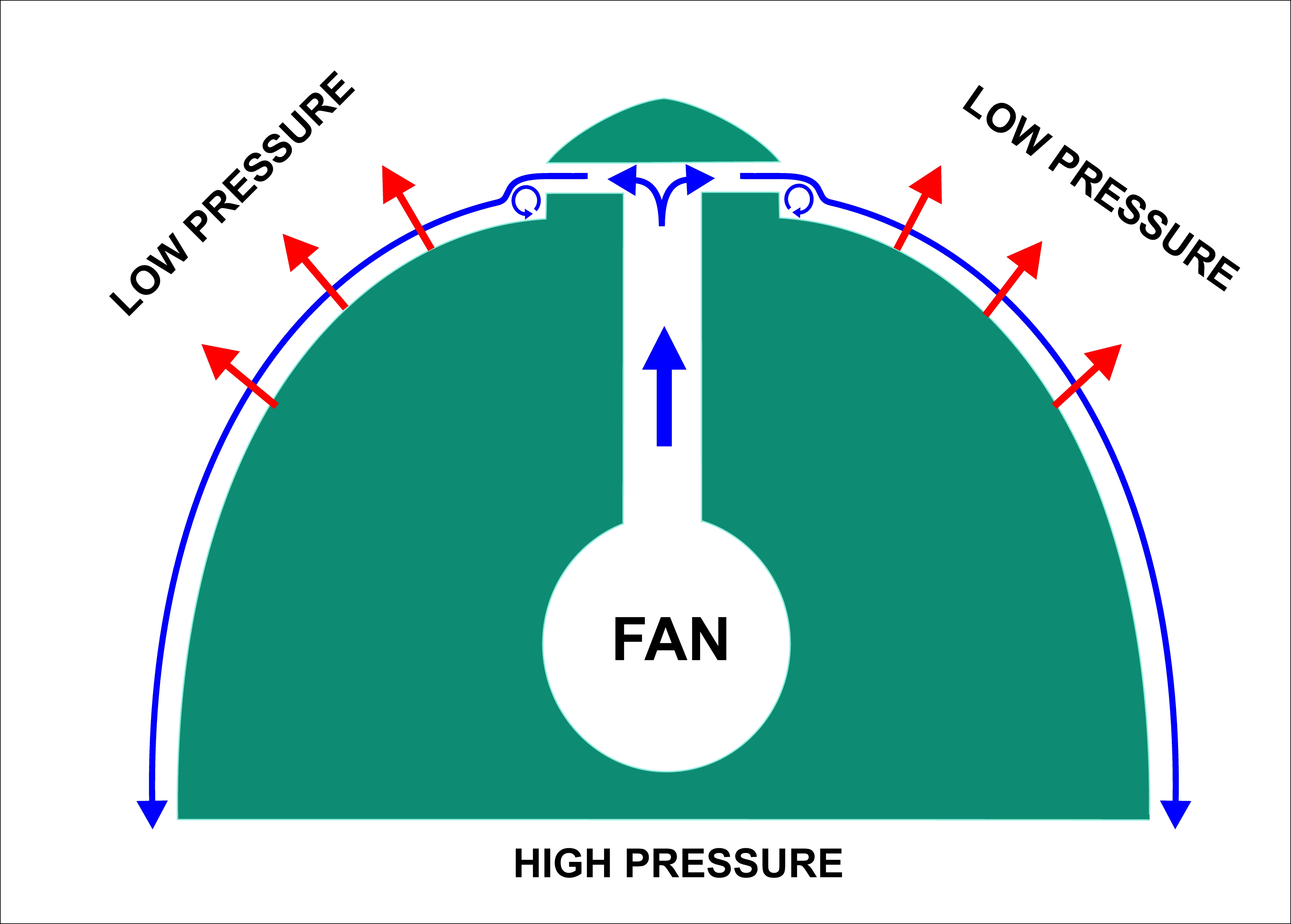 공조에서 코안다 효과는 천장에 설치된 확산기의 투사 거리를 증가시키는 데 활용된다. 코안다 효과 때문에 확산기에서 배출되는 공기는 천장에 "붙어"서, 인접한 천장이 없는 자유 공기 중에 확산기를 설치했을 때보다 같은 배출 속도로 떨어지기 전에 더 멀리 이동한다. 낮은 배출 속도는 낮은 소음 수준을 의미하며, 가변 풍량(VAV) 공조 시스템의 경우 더 큰 턴다운 비율을 허용한다. 천장과의 접촉 길이가 더 긴 선형 확산기와 슬롯 확산기는 더 큰 코안다 효과를 나타낸다.[22]5. 4. 유체 공학
