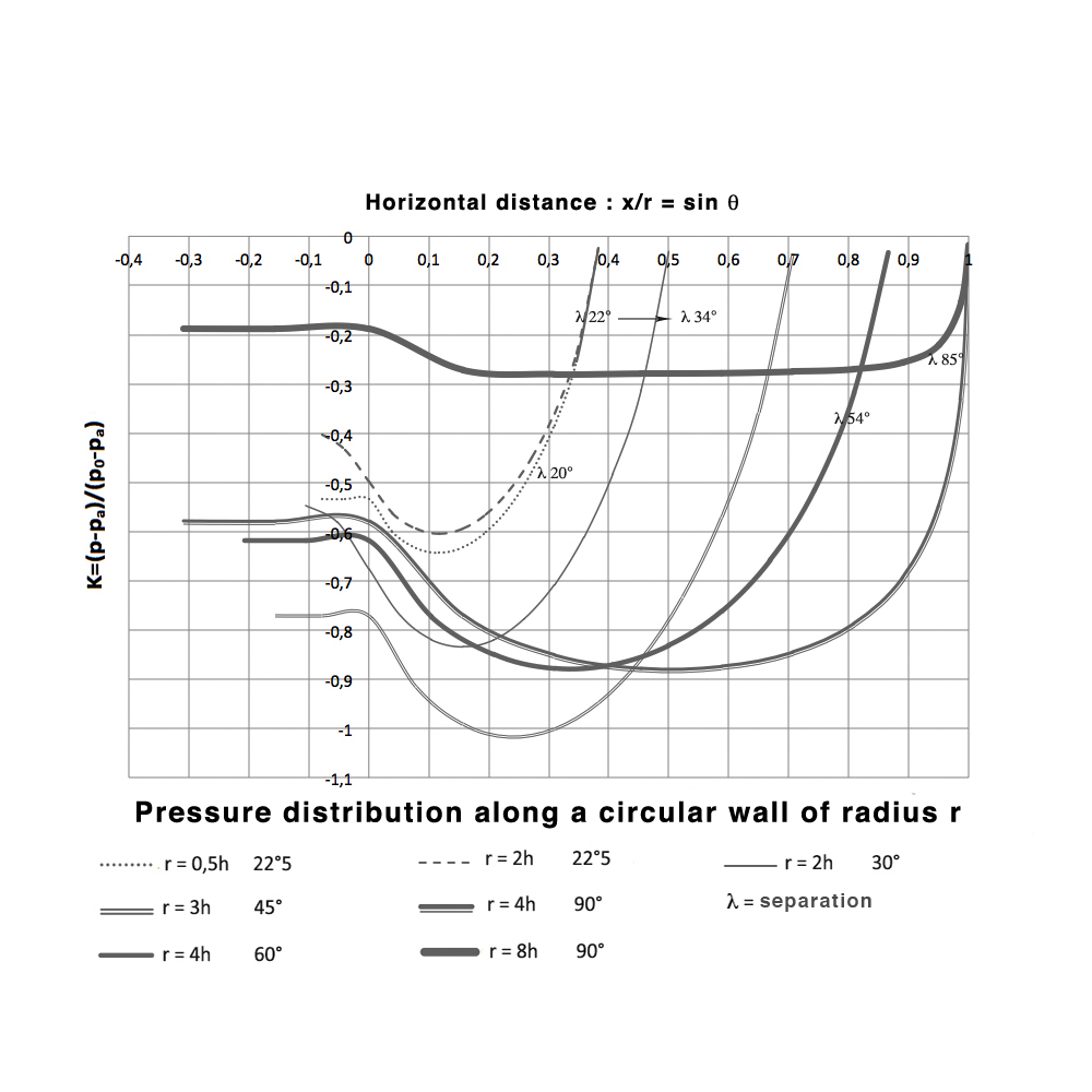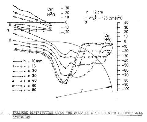 1956년에 다양한 제트 폭 ()에서 레이놀즈 수가 106인 난류 공기 제트를 사용하여 수행된 실험은 제트 기원으로부터 일련의 수평 거리에서 원형 곡선 벽 반지름 ()을 따라 측정된 압력을 보여준다.[11][12]