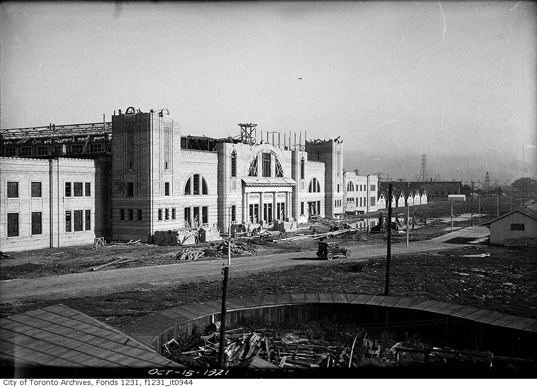 1921년 7월 27일, 토마스 처치 토론토 시장이 초석을 놓았다.[8] 캐나다 국립 전시회(CNE) 회장 로버트 플레밍은 이 건물이 8.5에이커(3.4 헥타르)의 바닥 면적을 가진 세계 최대 규모가 될 것이라고 선언했다.[9][10]