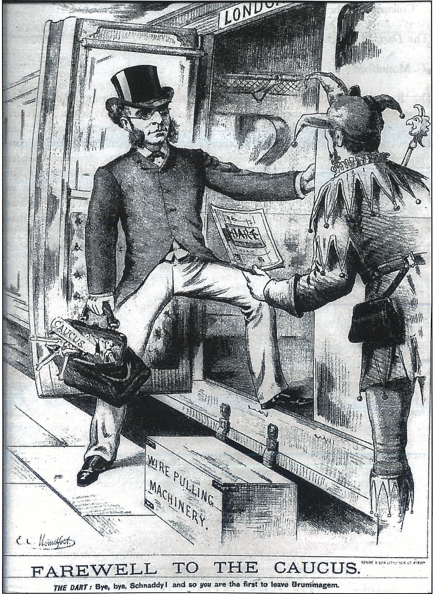 1867년 개혁법에 따라 버밍엄 지역에 세 개의 선거구가 할당되었지만, 각 유권자는 두 표만 행사할 수 있었다. 득표수를 균등하게 분배하기 위해 버밍엄 자유 연맹의 사무총장인 윌리엄 해리스(후에 "코커스의 아버지"로 불림)는 선거구 위원회, 일반 위원회, 집행 위원회, 관리 위원회로 구성된 네 단계의 조직 구조를 고안했다. 이 구조를 통해 서로 다른 선거구의 자유당 유권자들은 표를 행사할 정확한 조합에 대한 지시를 받을 수 있었다.[26][27][28] 1877년 새로 결성된 국민 자유 연맹은 조지프 체임벌린의 주도로 유사한 구조를 갖게 되었으며, 이 역시 해리스에 의해 자세히 연구되었다.[29]얼마 지나지 않아 "코커스"라는 용어는 이 시스템에 적용되었다. 더 타임스 신문은 "모든 악을 가진 '코커스'"를 언급했으며, 보수당 총리인 벤자민 디즈레일리도 이를 언급했다.[30][31][32][33][34] 1880년 빅토리아 여왕은 디즈레일리와의 만남 이후, 개인적인 메모에서 "코커스라고 불리는 그 미국식 시스템"에 대해 비난하는 어조로 적었다.[35] 자유당 코커스는 사회주의자와 노동조합원들에게도 비난을 받았다. 그들은 (독립노동당 설립 전) 노동 대표 연맹 및 노동 선거 협회를 통해 자유당을 거쳐 의회 진출을 모색했지만, 당의 관리 구조에 의해 길이 막혔다.[36]