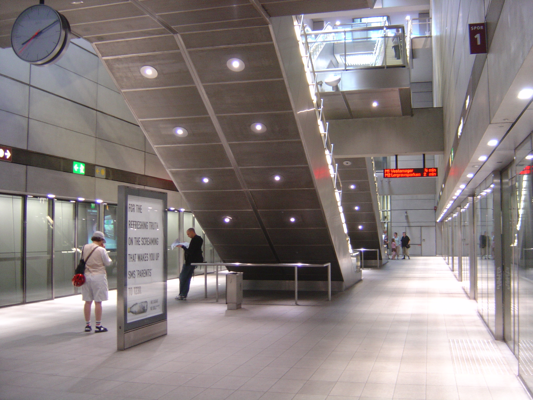 코펜하겐 지하철에는 37개의 역이 있으며,[65] 대부분 KHR Arkitekter가 설계한 현대적인 디자인을 갖추고 있다. 모든 역은 휠체어 이용자를 포함한 모든 승객이 편리하게 이용할 수 있도록 설계되었다.[71]