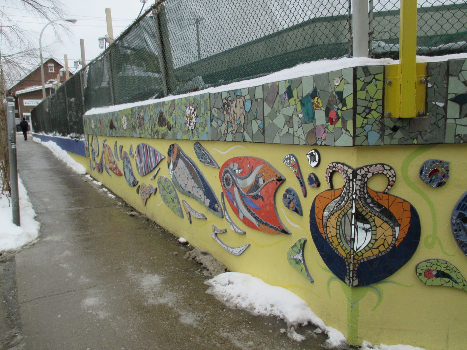 2016년 10월에는 '콕스웰 레인웨이 모자이크 벽화'가 공개되었다. 당시 TTC 의장이었던 조쉬 콜은 공개 행사에서 "TTC에서 공공 예술은 우리의 자산을 아름답게 할 뿐만 아니라 역 개선 프로젝트의 촉매가 되었다"고 언급했다. 이 벽화는 콕스웰역 버스 루프와 동쪽 보행자 통로 및 남쪽 주차장을 구분하는 벽 외부에 설치되었으며, 과거와 미래를 상징하는 두 부분으로 구성되어 있다. 지역 예술가 크리스티나 델라고가 이끄는 그룹이 제작했다.[5] 이 벽화가 설치된 레인웨이는 역과 댄포스 애비뉴를 연결하며, 과거 홀린저 버스 라인 터미널 건물(현재는 식당) 옆을 지나간다.[8]