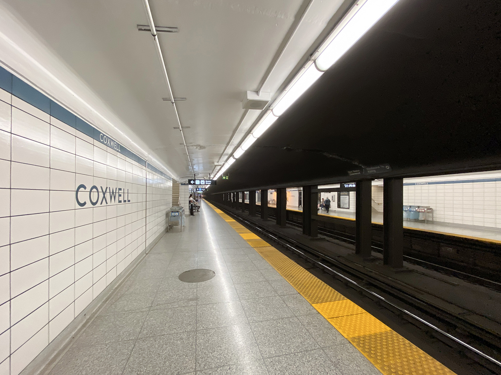 콕스웰역은 개통 초기 인근 지역 주민들과 남쪽의 비치 지역, 동쪽의 이스트요크 및 버몬지/오코너 인근 공단 지역으로 향하는 승객들을 위한 비교적 작은 규모의 역이었다.[21] 1968년 5월 10일, 블루어-댄포스선이 워든역까지 연장되면서 버스 노선에도 변화가 생겼다. 버몬지를 따라 운행하던 버스는 우드바인역으로 노선이 변경되었고, 오코너 버스는 세인트클레어 애비뉴를 따라 워든역까지 연장 운행하게 되었다.[18][22]