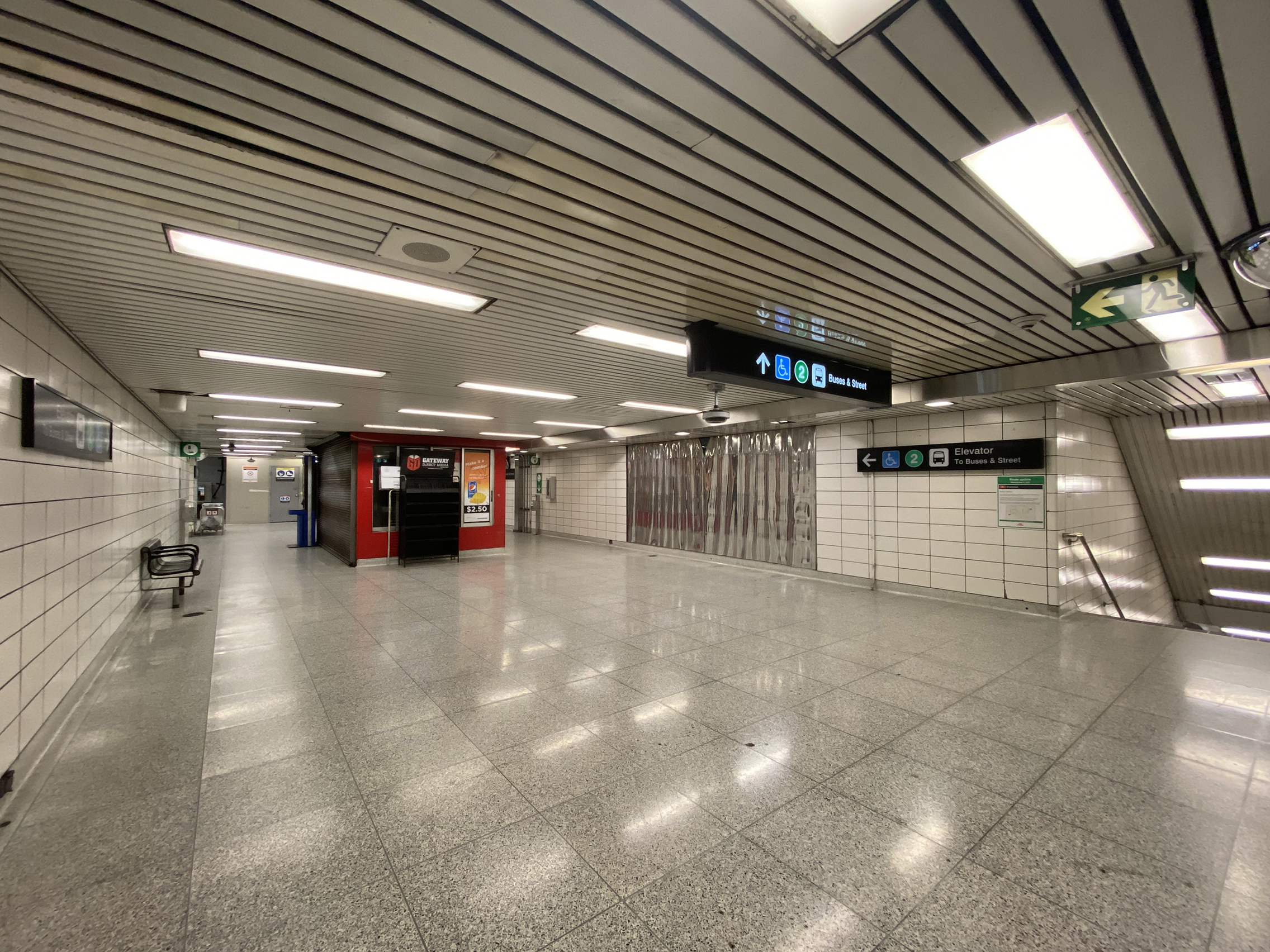 역과 댄포스 애비뉴를 연결하는 레인웨이(Laneway)는 현재 식당으로 사용되는 구 홀린저 버스 라인 터미널 건물을 지나간다.[8]