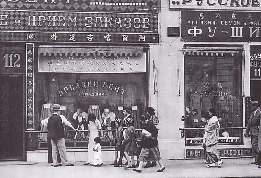 만년의 네차예프는 백계 러시아인들의 만주국(하얼빈 러시아인 상점 사진) 공동체 지도자로 활동했다.