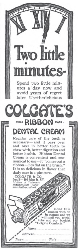 1950년대에 콜게이트는 카피라이터 알리시아 토빈이 제작한 "치아를 닦는 동시에 입냄새를 제거합니다"라는 슬로건으로 인기를 얻었다.[2]
