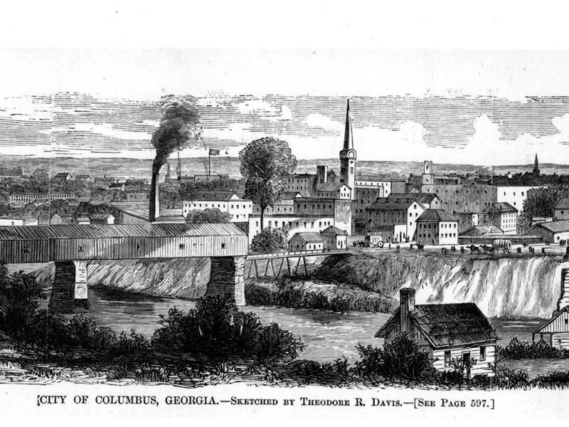 1861년에 남북 전쟁이 발발하자 콜럼버스의 면직물 산업은 군수품으로 더욱 확대되었다. 게다가 콜럼버스에는 미국 연합국 해군의 철공소와 조선소도 세워졌다. 그러나 그 반면, 공장 노동자들은 남군 병사로 전쟁터로 보내졌다. 북군이 애틀랜타 전역을 전개하고 있는 동안에는 콜럼버스 시내의 상점, 술집, 교회, 그리고 지방 법원까지 야전 병원이 되었다. 로버트 E. 리의 항복 1주일 뒤인 1865년 4월 16일, 제임스 H. 윌슨이 이끄는 북군은 리의 항복을 알지 못하고 콜럼버스를 공격하여 시내의 공장을 불태웠다[68]。