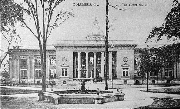1828년, 조지아주 의회는 챗터후치 강의 폭포선 이 지역에 도시 설립을 의결했다. 콜럼버스라는 도시 이름은 워싱턴 어빙의 크리스토퍼 콜럼버스를 소재로 한 소설에 영향을 받은 정착민들이 콜럼버스에서 이름을 따서 붙인 것으로 생각된다. 설립된 콜럼버스 시는 남북으로 13블록, 동서로 불과 9블록의 넓이였다.